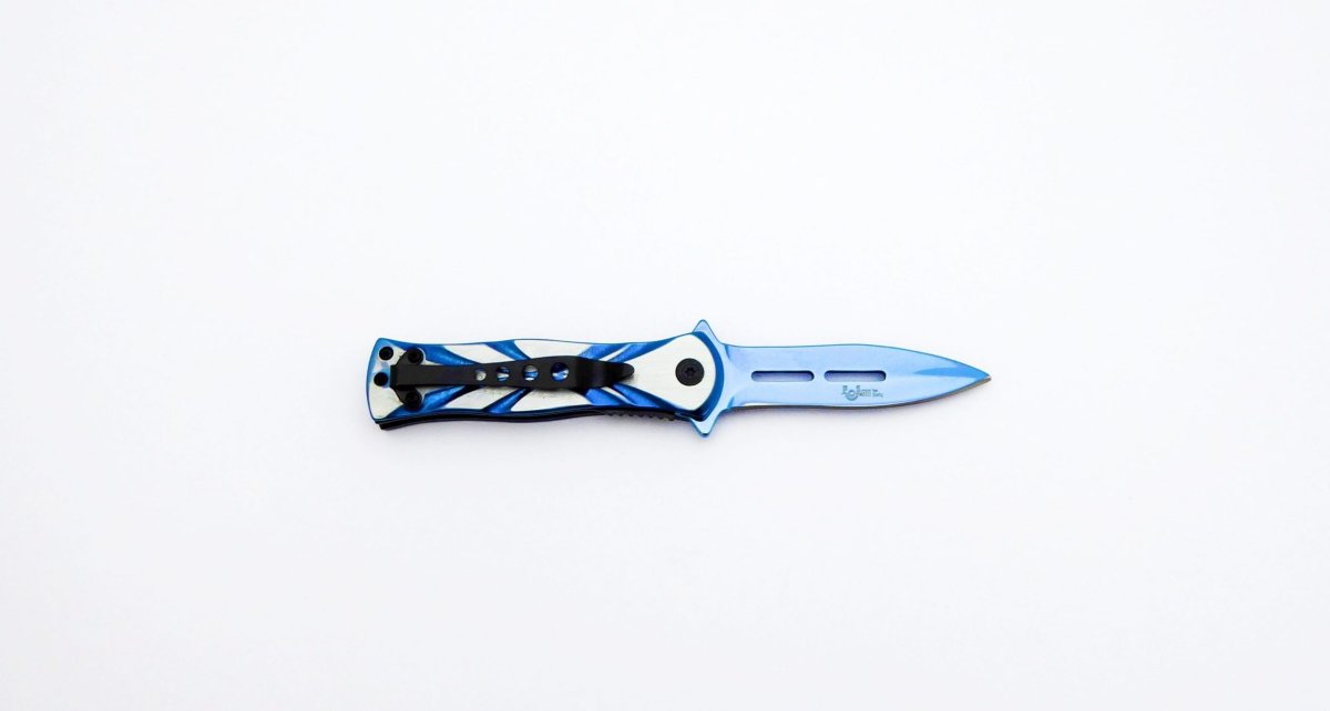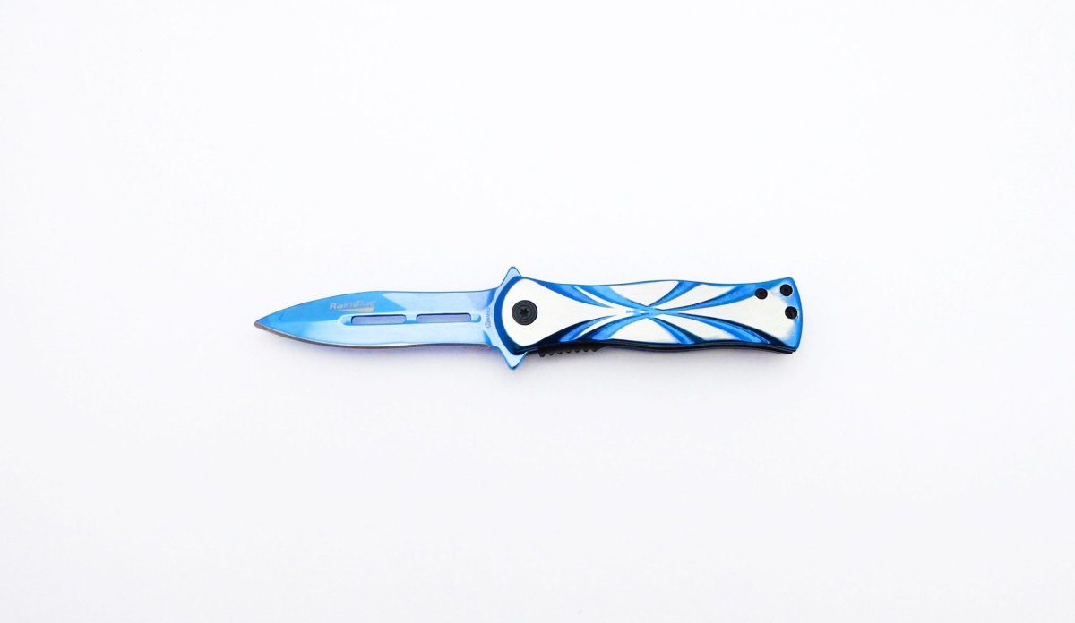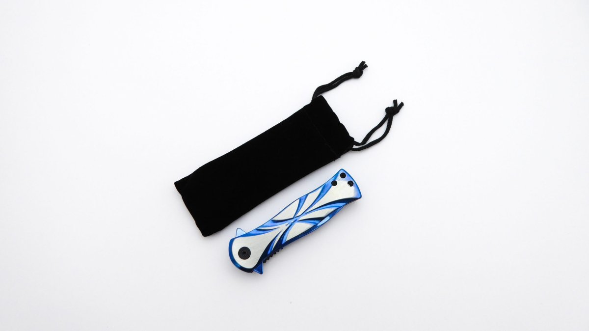 Descripción: Navaja fantasía RAINBLUE con mango de acero inoxidable acabado Rainblue. Hoja de acero molibdeno vanadio calada acabado Rainblue, punta espada. Clip porta cinturón, bloqueo Liner lock y sistema de apertura asistida rápida (FOS). Incluye funda de terciopelo negro.