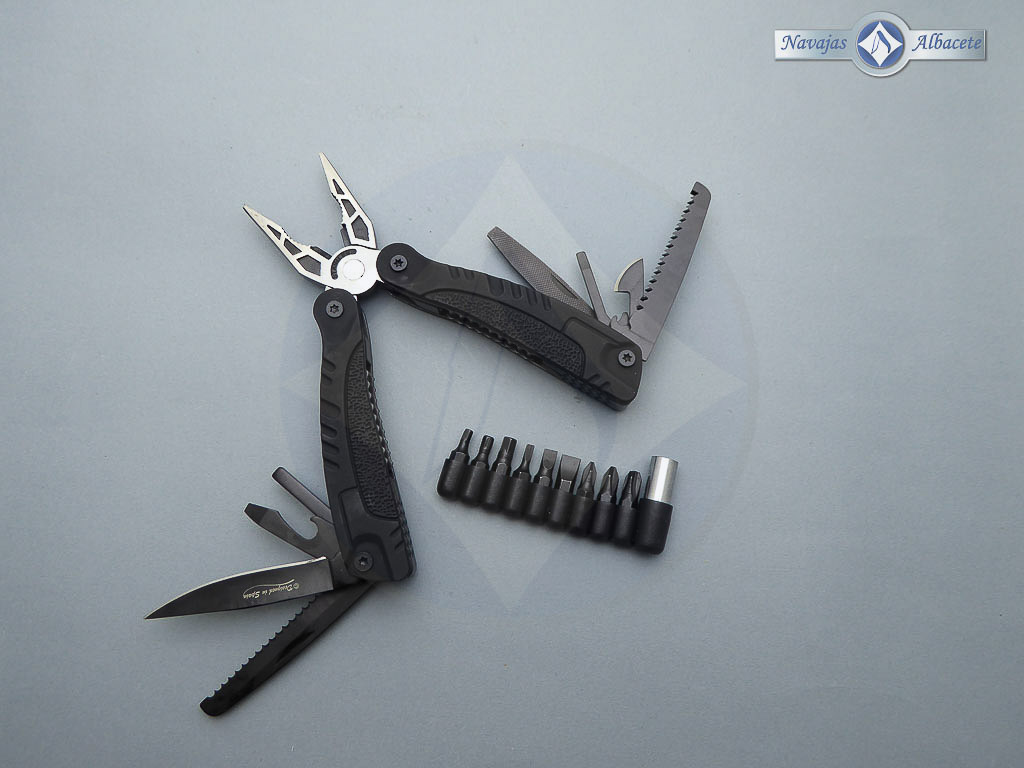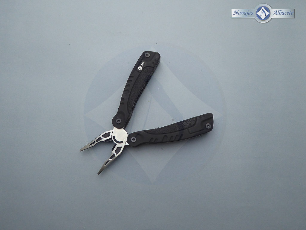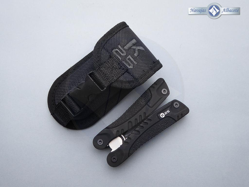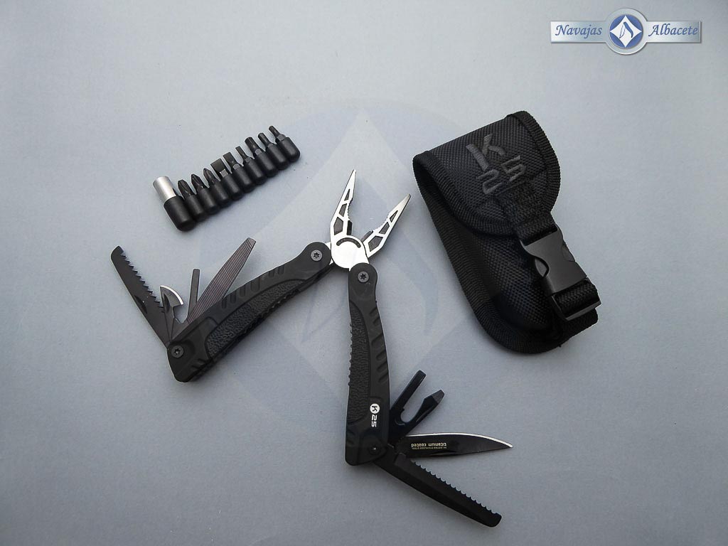 Descripción: Alicate táctico multifunción K25 con mango de aluminio engomado color negro y hoja de acero inoxidable bañado en titanium de gran resistencia. 20 usos. Incluye funda de nylon K25 moldeada con trabilla trasera y set de 10 puntas intercambiables. Diseñado en España.