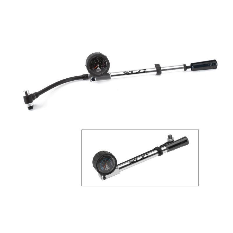 Bomba de aire a presión para horquillas y amortiguadores. Con manómetro de precisión y carcasa de aluminio.
