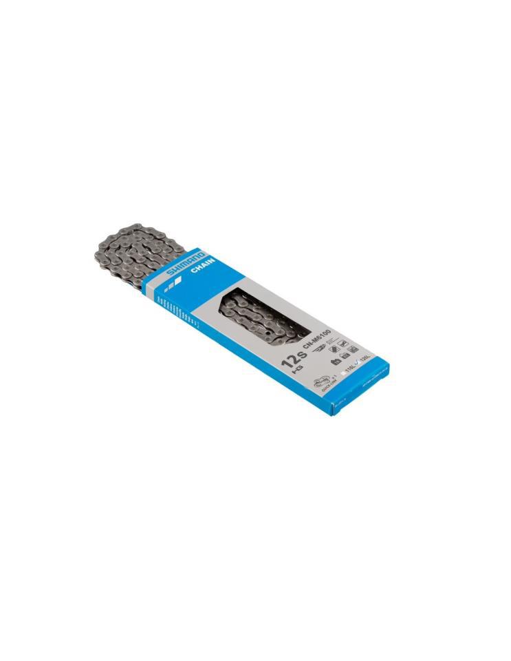La CN-M6100 de Shimano es una cadena direccional al nivel de Deore utilizada en sistemas de 1×12 velocidades. Se mantiene unida por un cierre de cadena Quick-Link.