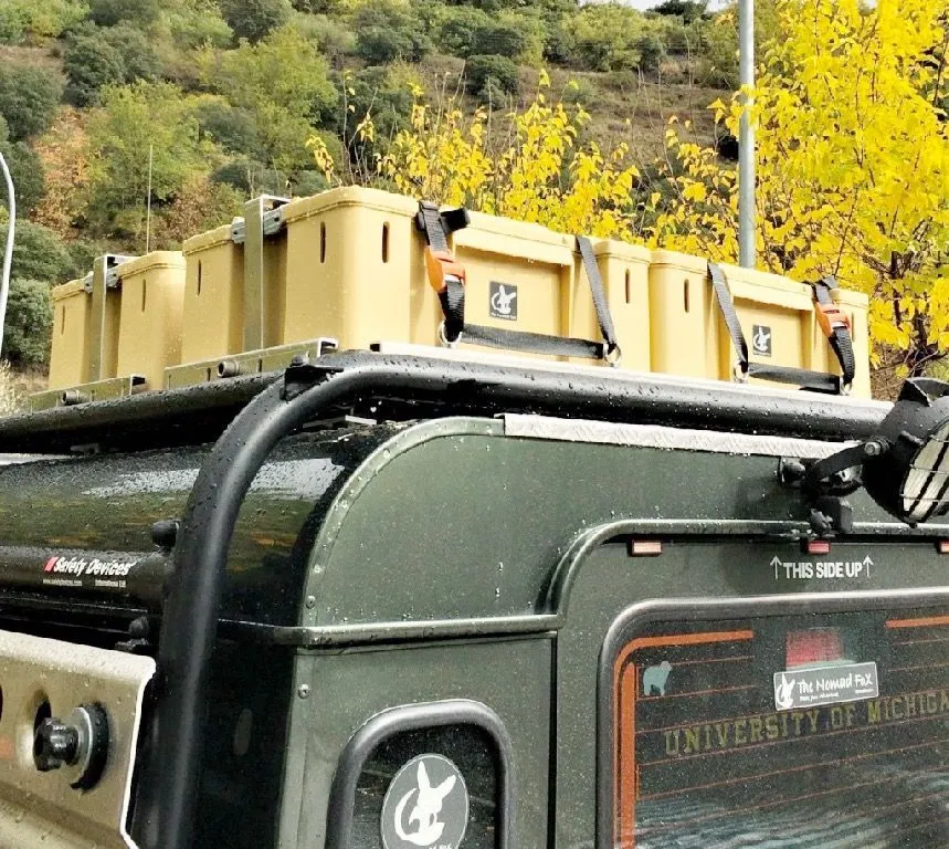 Dos prácticos recuadros rectangulares en la tapa te permiten colocar etiquetas para clasificar su contenido. Los 8 orificios en la parte superior sirven para cerrar las cajas con bridas para una mayor seguridad. Las cajas de almacenaje se pueden colocar tanto dentro del vehículo como en el techo.