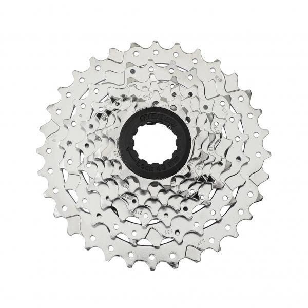 Cassete de 7 velocidades con piñones desde 12 a 32 dientes.