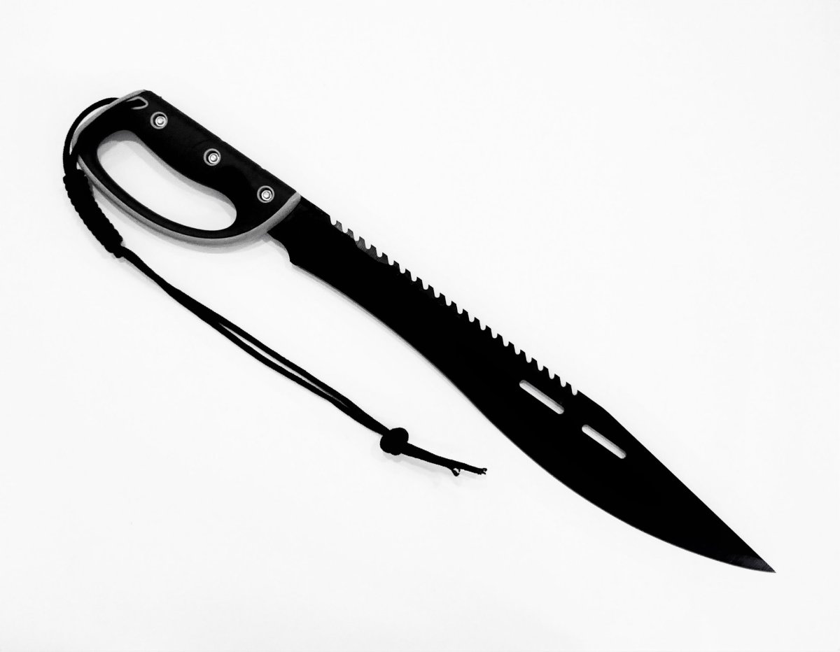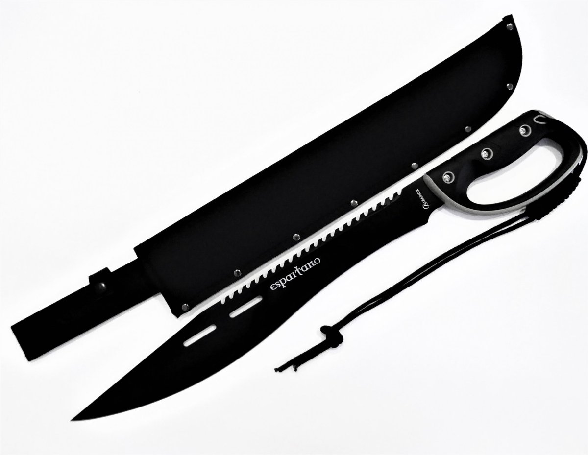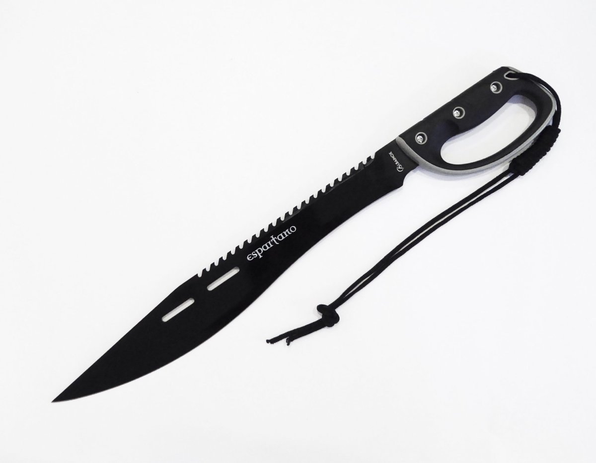 Descripción: Cortacañas ESPARTANO con mango en plástico ABS y goma, negro y gris. Agarre perfecto. Hoja de acero inoxidable molibdeno vanadio calada acabado negro, un solo filo, sierra en el lomo. Incluye funda de nylon negro con clip de seguridad y trabilla para cinturón. Cordón en el puño.