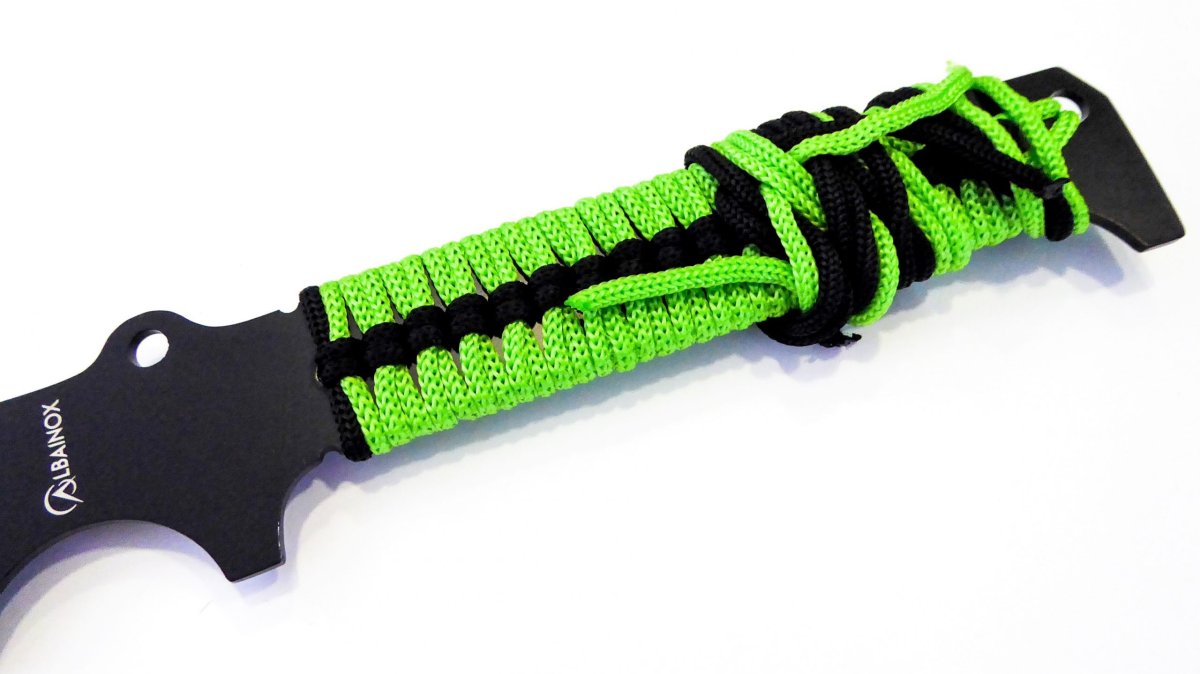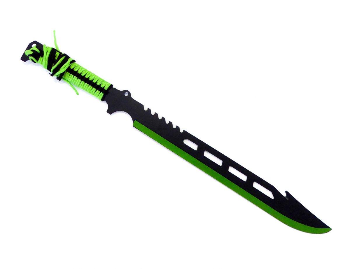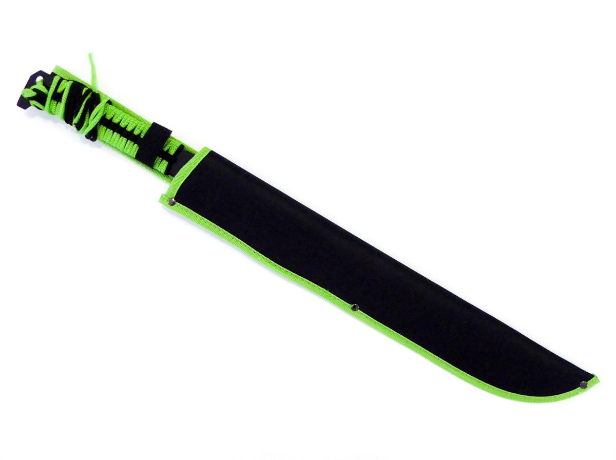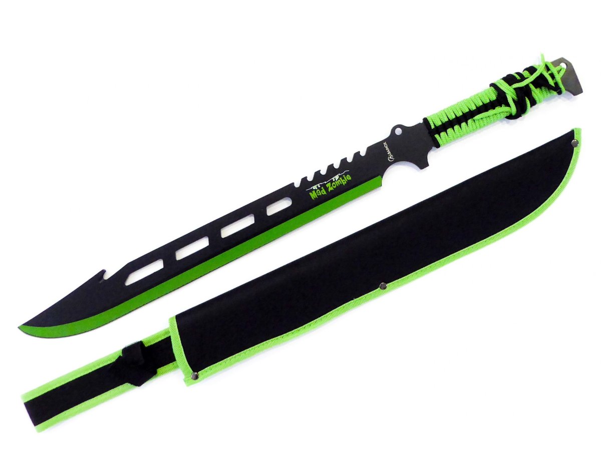 Descripción: «Mad Zombie» Machete cortacañas fantasía, con mango de acero acabado negro, encordado verde y negro. Hoja de acero inoxidable molibdeno vanadio calada acabado negro con impresión Mad Zombie. Incluye funda de nailon negra y verde, con trabilla para cinturón.