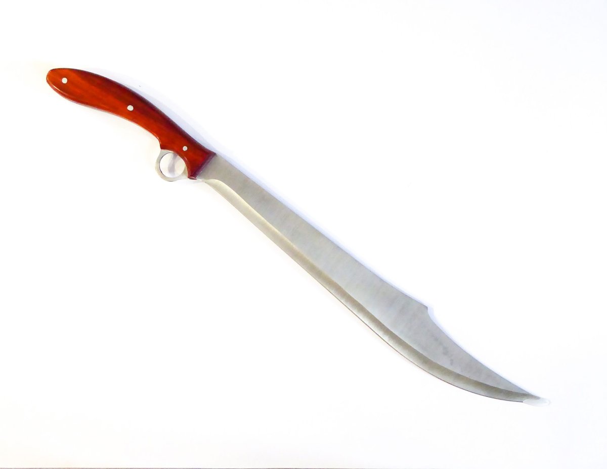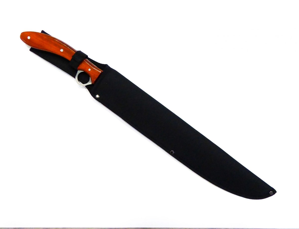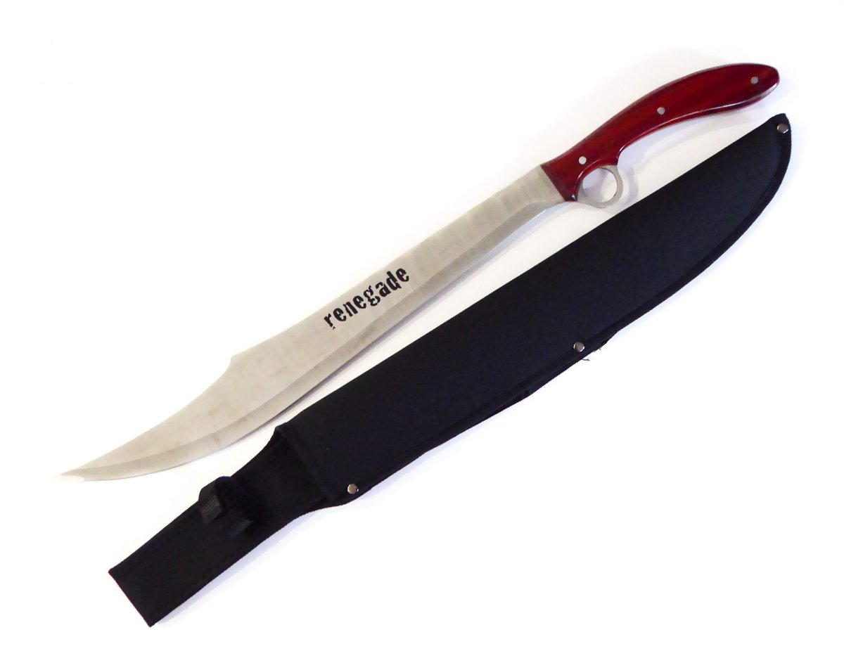 Descripción: «Renegade» Machete cortacañas con mango de madera. Hoja de acero inoxidable molibdeno vanadio acabado satinado, con impresión renegade. Un solo filo. Incluye funda de nylon con trabilla para cinturón y correa ajustable para su transporte.