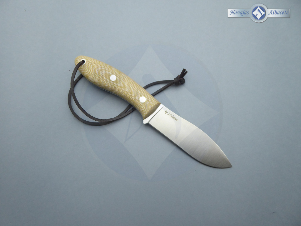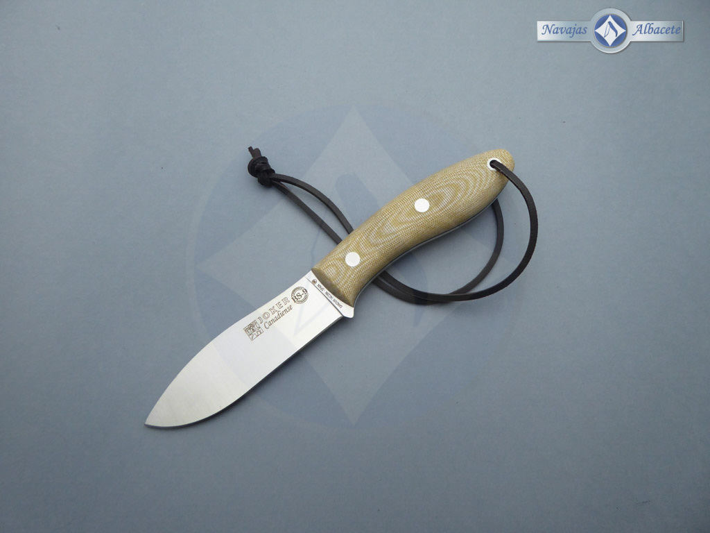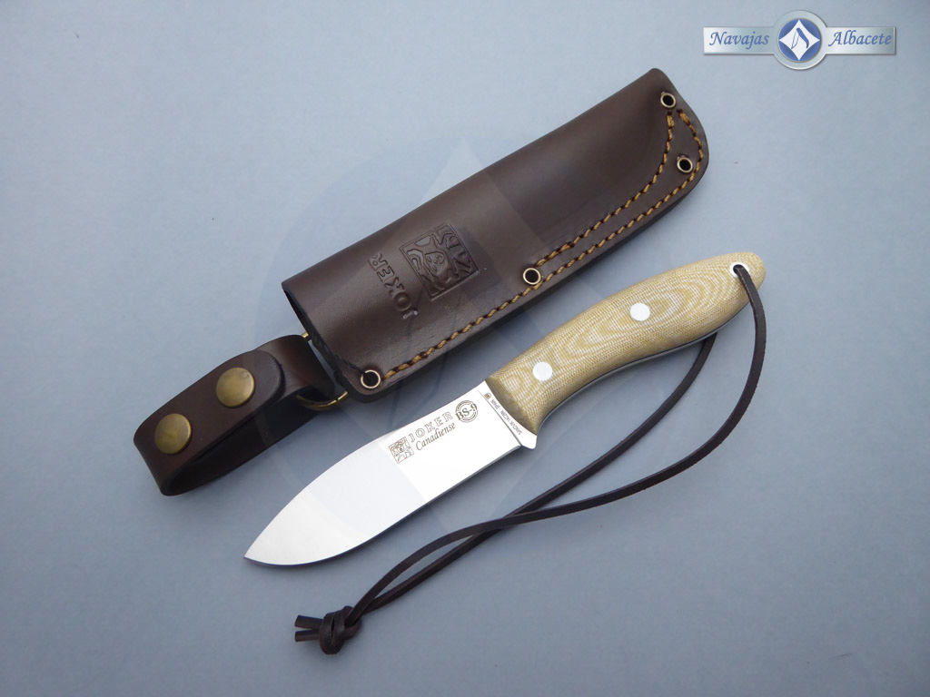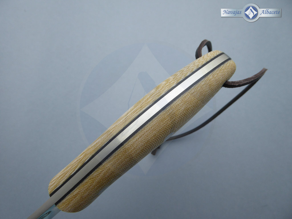 Descripción: Cuchillo de monte «Canadiense» con mango micarta beige con separador negro y cordón de cuero en el pomo. Hecho a mano en Albacete. Hoja de acero Sandvik 14C28N de alta resistencia y durabilidad. Incluye funda de piel marrón de gran calidad con trabilla para cinturón. Herramienta de gran calidad para monte, caza, pesca, camping, senderismo, Bushcraft, etc.
