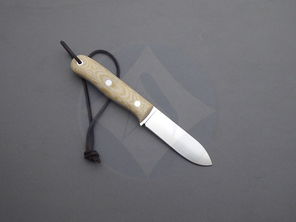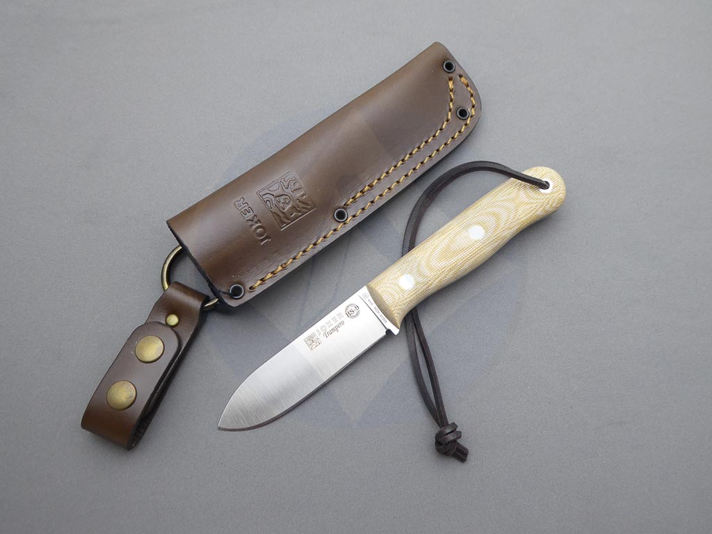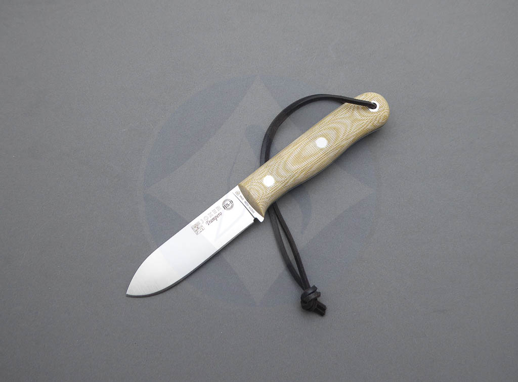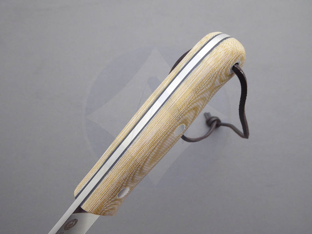 Descripción:  «Trampero» Cuchillo de monte Bushcraft con mango micarta beige con separador negro y cordón de cuero. Hecho a mano en Albacete. Hoja de acero sandvik 14C28N de alta resistencia y durabilidad. Incluye funda de piel marrón de primera calidad con trabilla para cinturón. Indicado para realizar diferentes actividades: como caza, pesca, supervivencia, camping,  etc. Disponible en diferentes acabados.