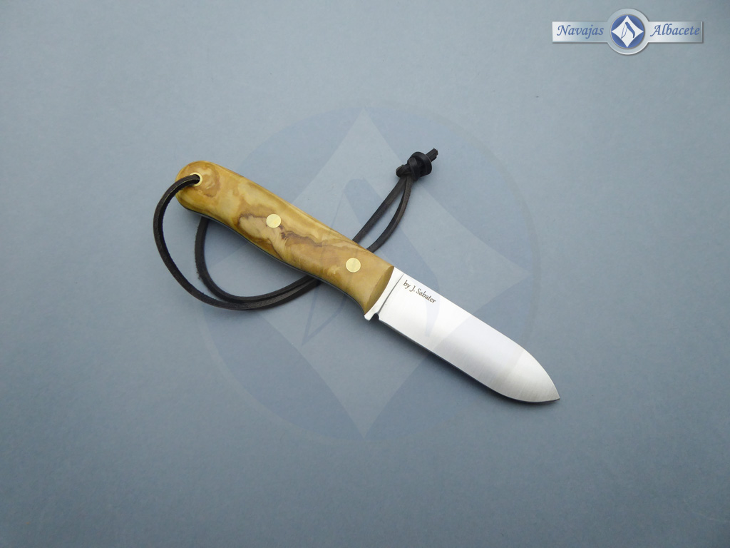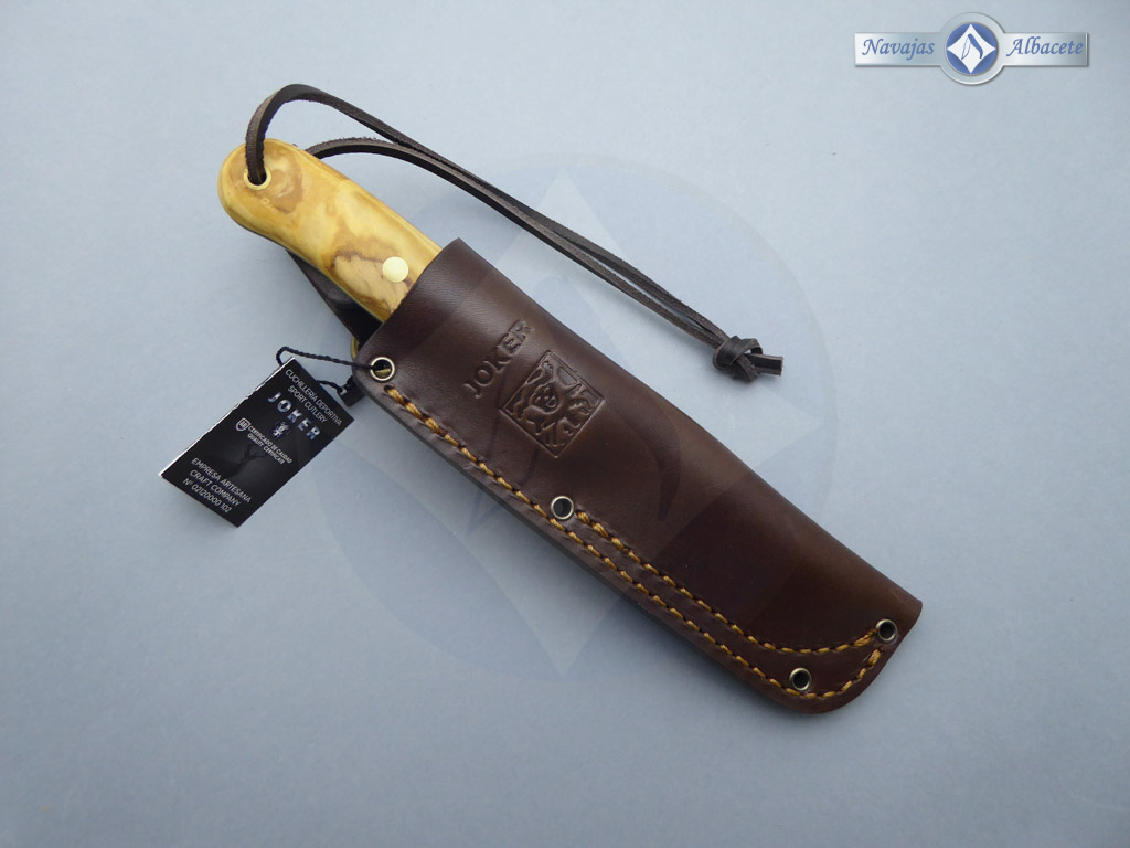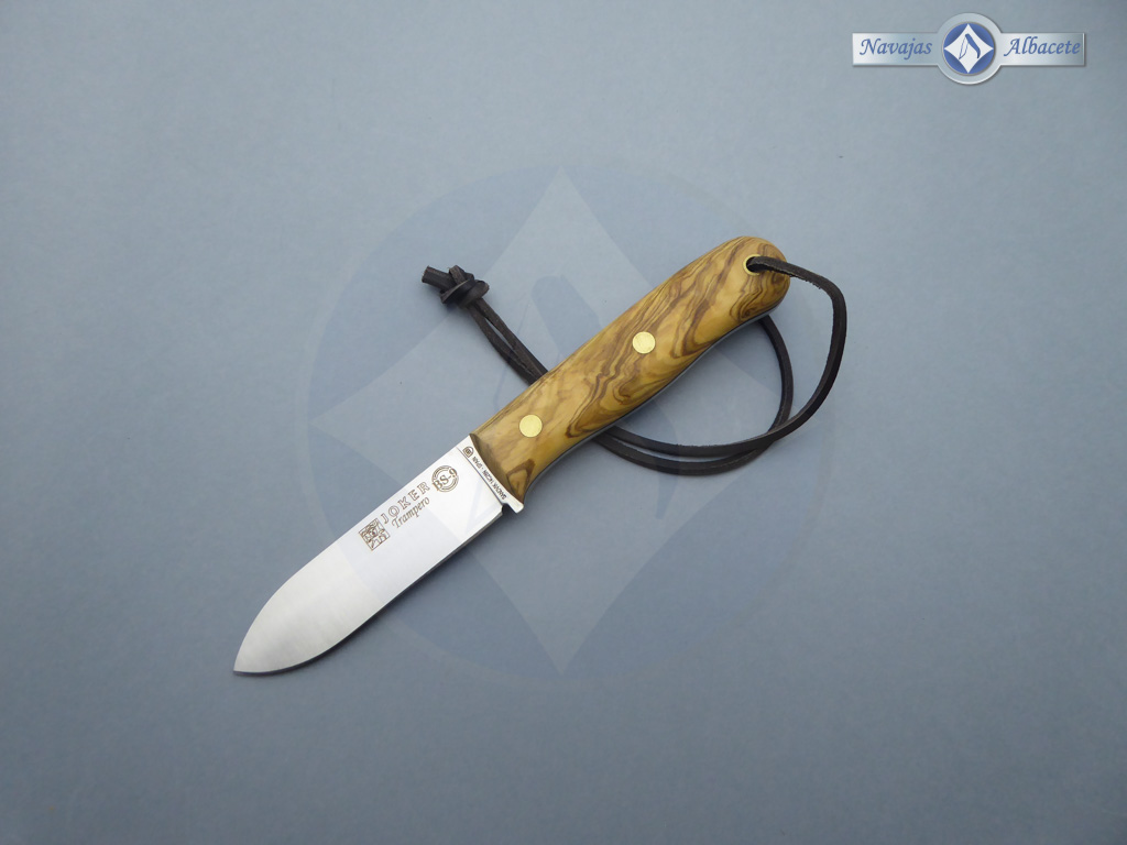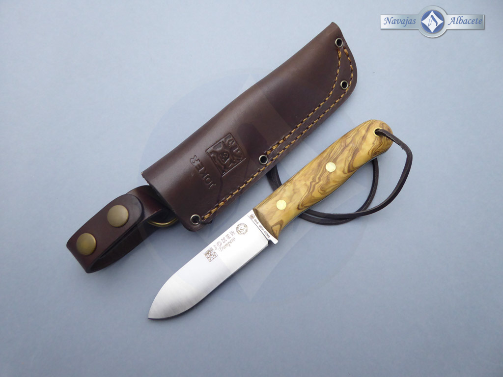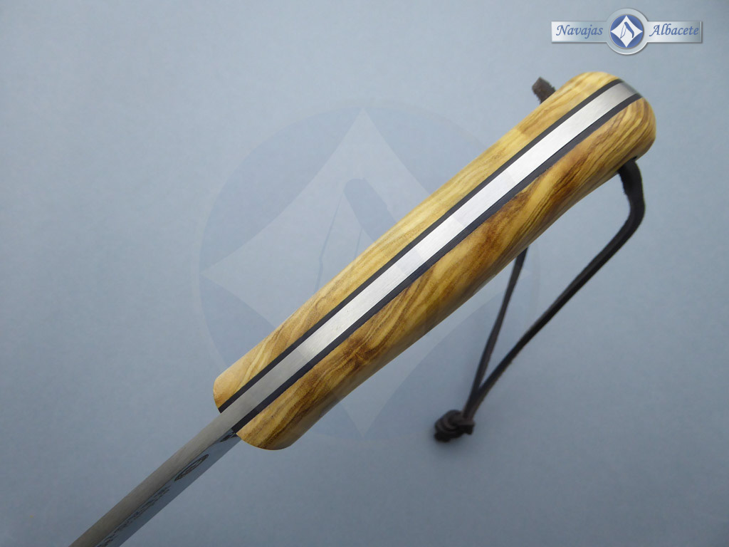 Descripción: Cuchillo de monte BS9 Trampero, con puño en madera de olivo con separador negro y cordón de cuero en el pomo. Hoja de acero Sandvik de alta resistencia y durabilidad. Incluye funda de cuero color marrón con trabilla para cinturón. Hecho a mano en Albacete. También disponible en distintos acabados.