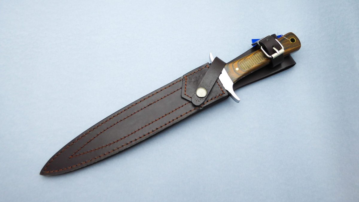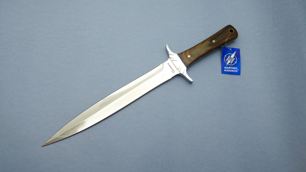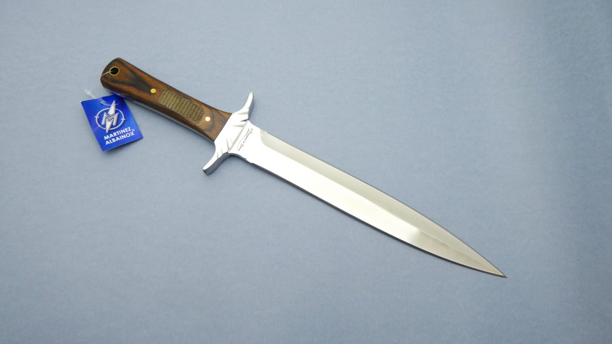 Descripción: Cuchillo deportivo «Daga Caza» con mango de madera stamina, con virola de acero. Hoja de acero inoxidable molibdeno vanadio acabado espejo, doble filo. Incluye funda de piel. Diseñado en España