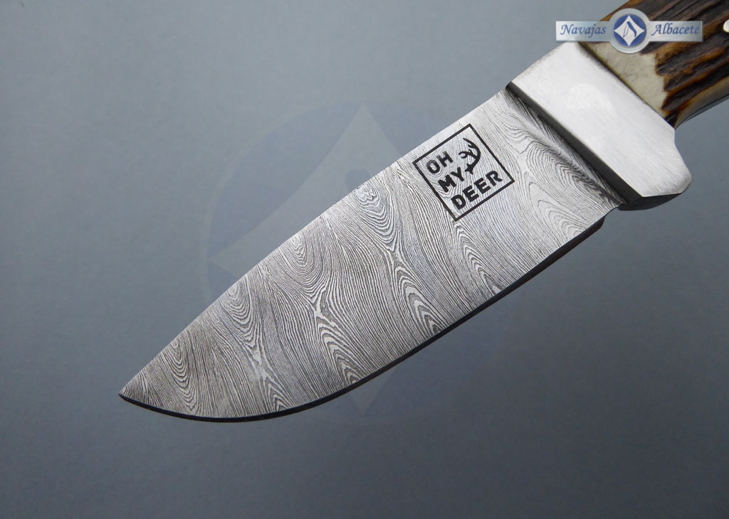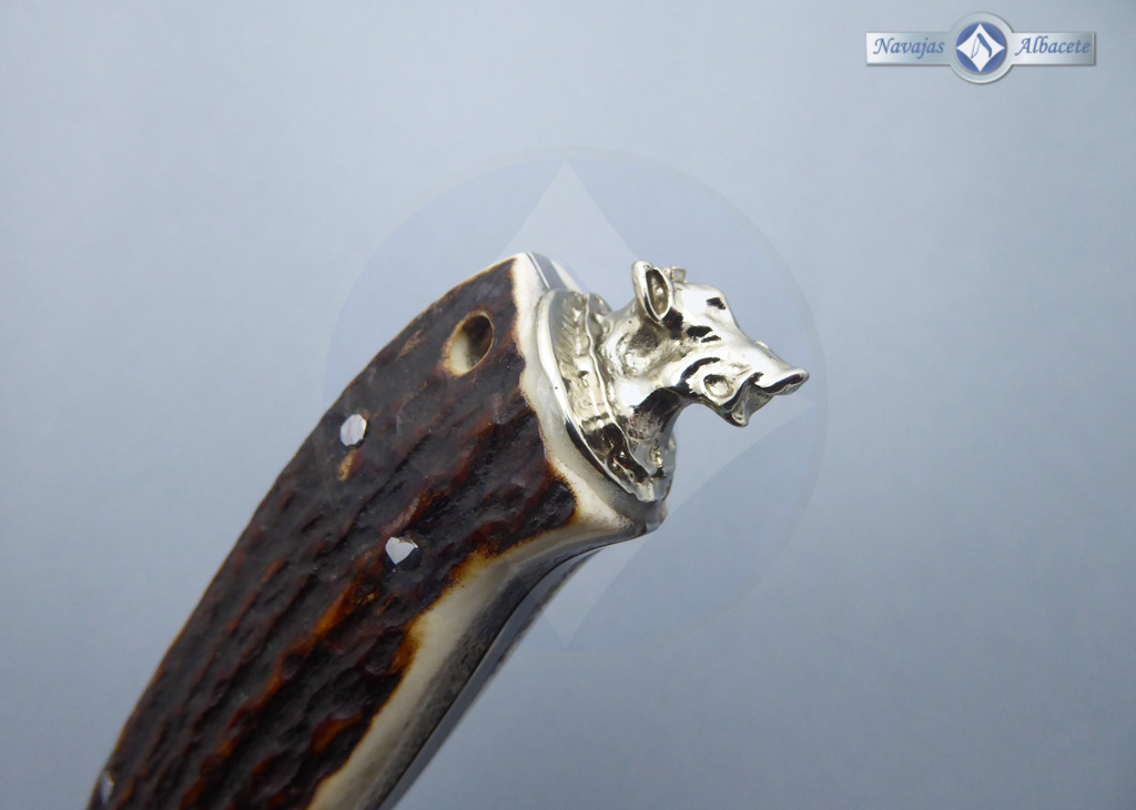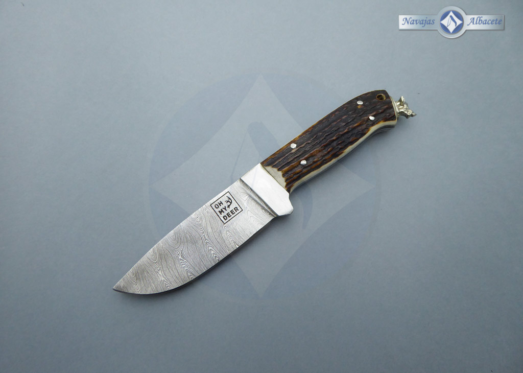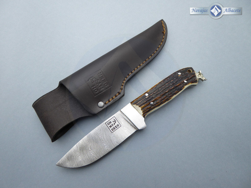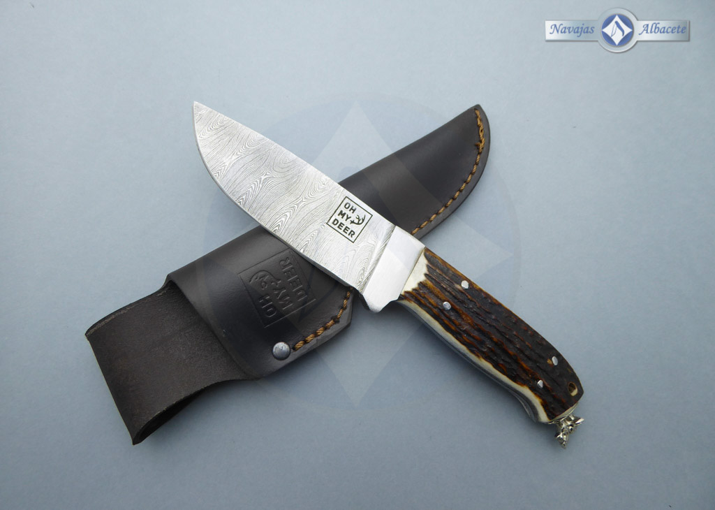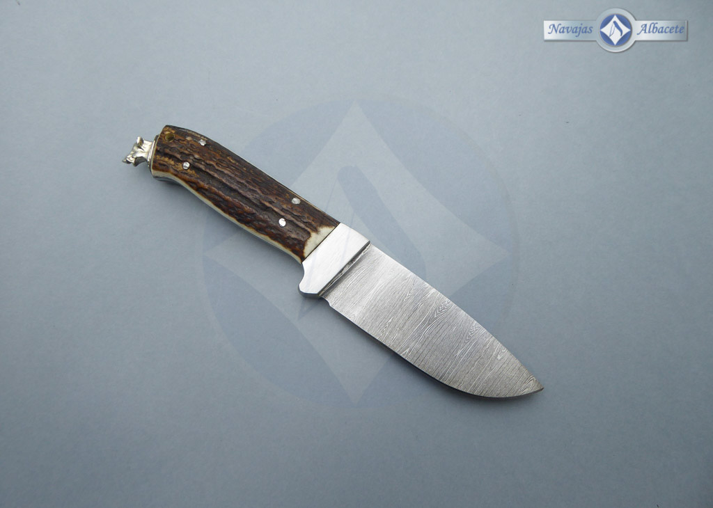 Descripción: Cuchillo enterizo artesanal con hoja de acero damasco inoxidable con 280 capas, de gran belleza y resistencia. Forjado a mano con aceros de la más alta calidad. Guarda de acero damasco pulida. Mango de asta de ciervo decorado en el pomo con la cabeza de un jabalí en acero inoxidable. Incluye funda de piel color marrón con trabilla para cinturón.