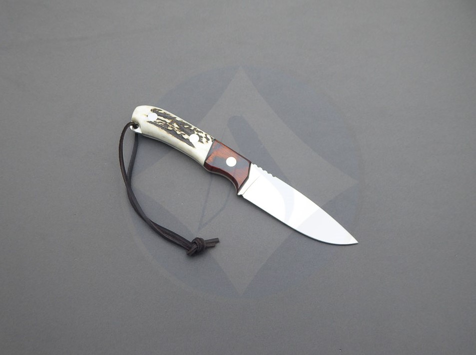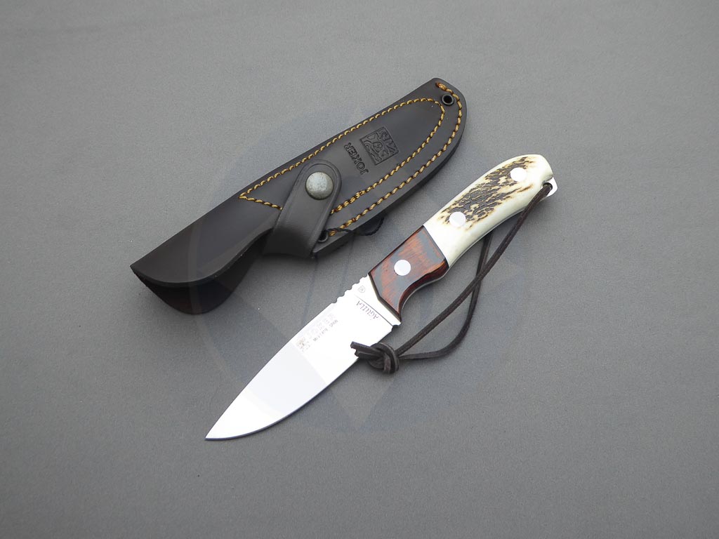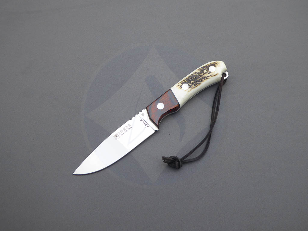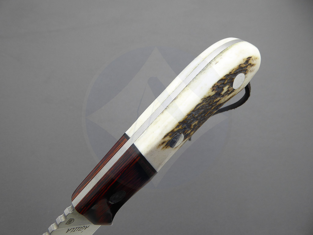 Descripción: Cuchillo de caza «Águila» con puño en asta de ciervo, virola en madera stamina. Lomo dentado. Ojal de acero en el pomo con cordón de piel. Hoja enteriza de acero inoxidable molibdeno vanadio de gran resistencia y durabilidad. Incluye funda de piel color marrón de gran calidad con trabilla para cinturón. Hecho a mano en Albacete.