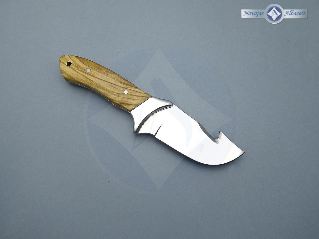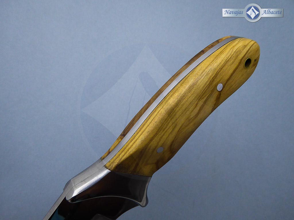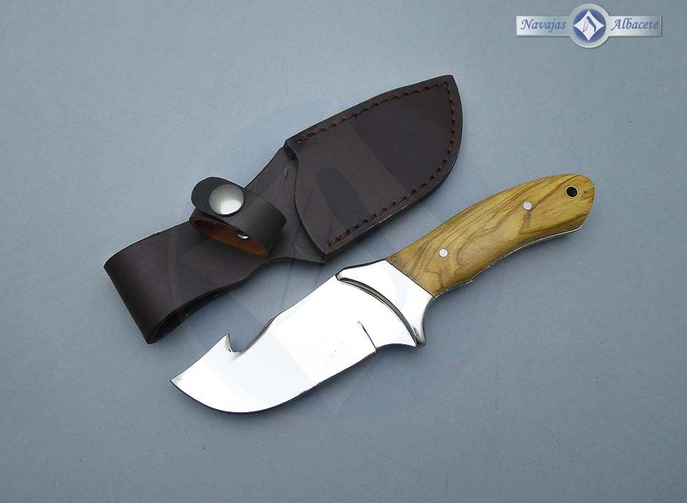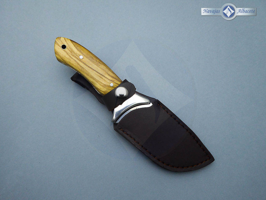 Descripción: Cuchillo de caza con mango de madera de olivo y virola de acero, de gran resistencia. Hoja de acero inoxidable molibdeno vanadio acabado espejo, con skinner de uso no profesional. Ojal en el pomo. Incluye funda de piel marrón con clip de apertura rápida y trabilla para cinturón. Peso total con funda 321 gramos.