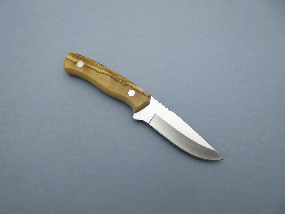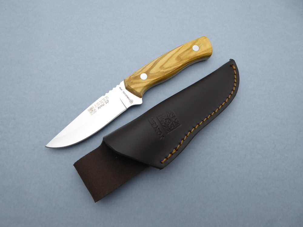 Descripción: «Arrui 10» Cuchillo de monte Bushcraft con puño de madera de olivo y hoja de acero inoxidable de alta resistencia. Hecho a mano en Albacete. Incluye funda de cuero marrón de primera calidad, con trabilla para cinturón. Indicado para diferentes actividades como caza, pesca, supervivencia, camping, etc. Disponible en distintos acabados.