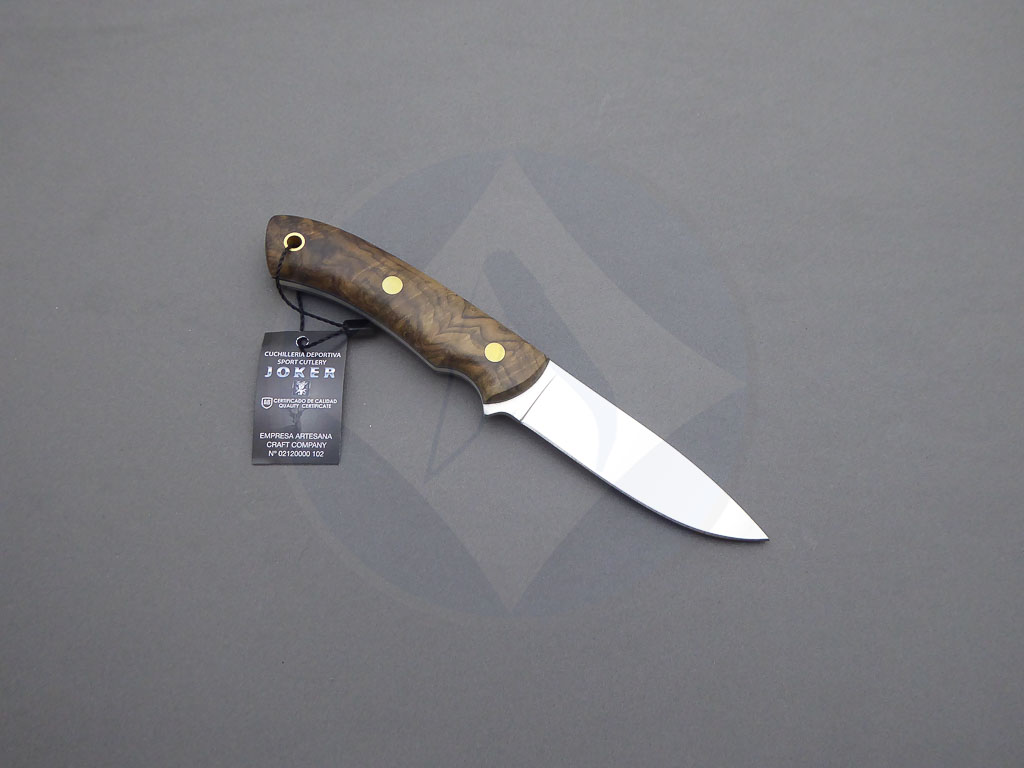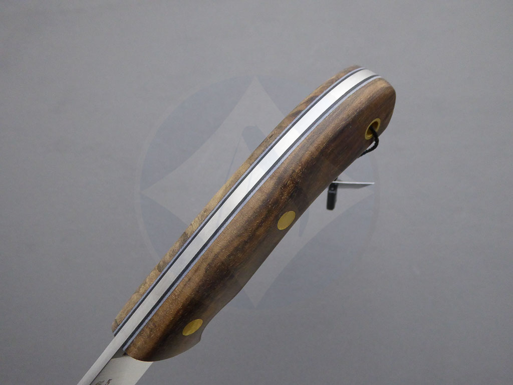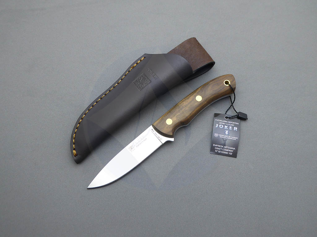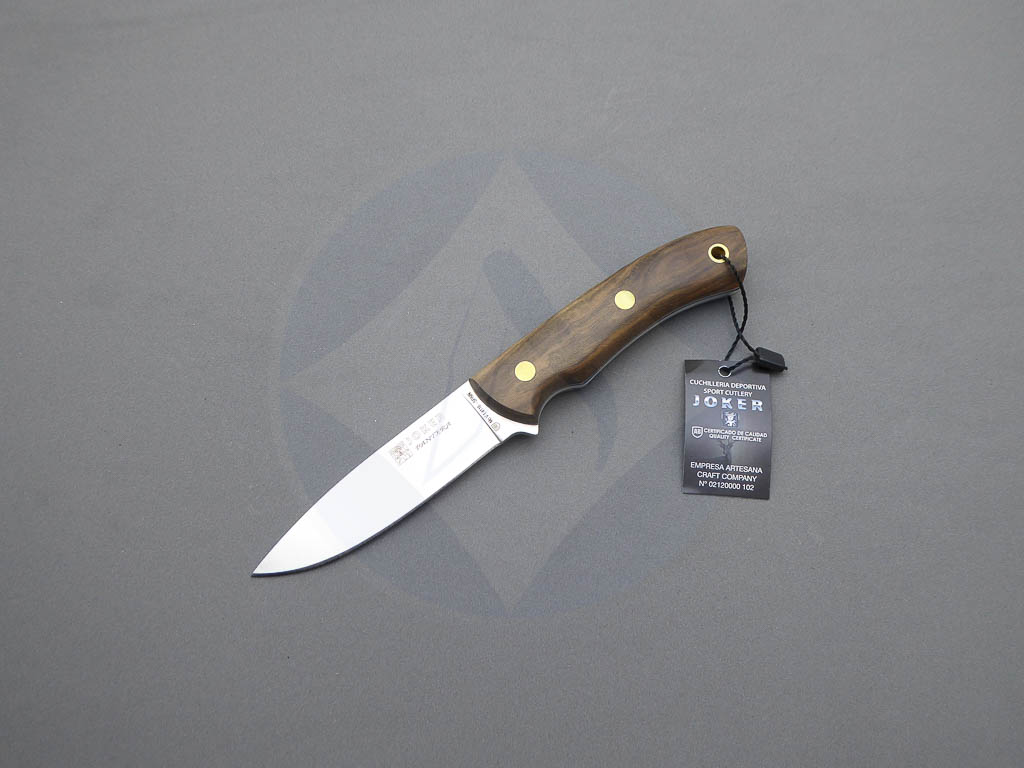 Descripción: Cuchillo deportivo «Pantera» con mango de madera de nogal, con separador negro. Hoja enteriza de acero inoxidable molibdeno vanadio de gran resistencia y durabilidad. Hecho a mano en Albacete. Incluye funda de piel color marrón de gran calidad con costura de alta resistencia y trabilla para cinturón. Bushcraft, caza.