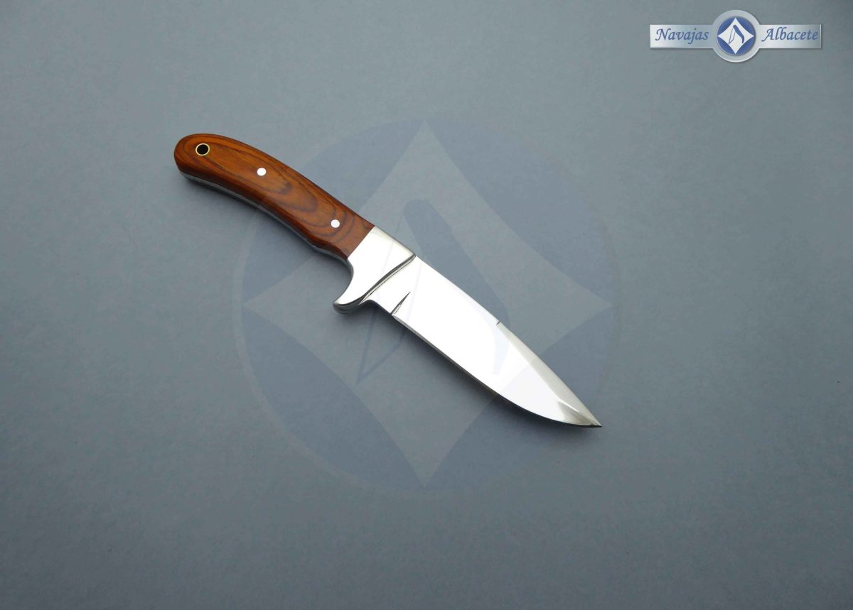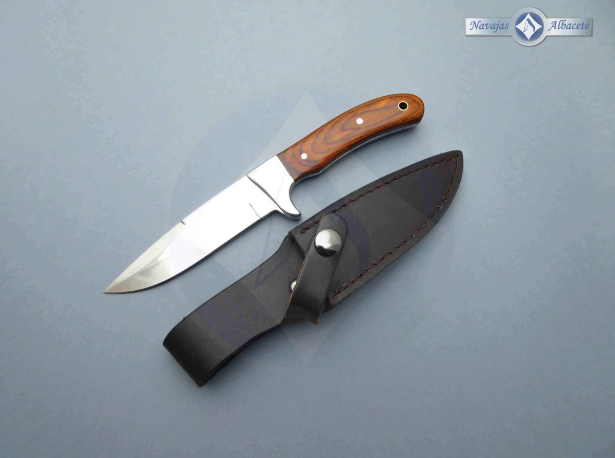 Descripción: Cuchillo deportivo con mango de madera estamina roja, virola de acero. Agujero en el pomo para pasar un cordón. Hoja de acero inoxidable molibdeno vanadio acabado espejo .Incluye funda de piel marrón con clip de seguridad y trabilla para cinturón.