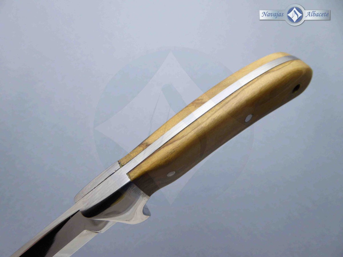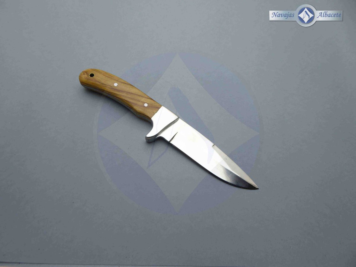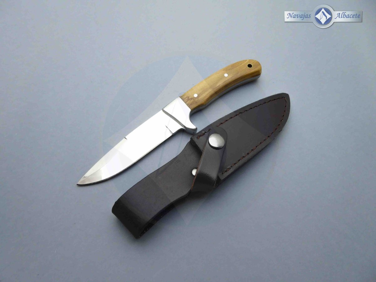 Descripción: Cuchillo deportivo con mango de madera de olivo, con virola de acero. Agujero en el pomo para pasar un cordón. Hoja de acero inoxidable molibdeno vanadio acabado espejo. Incluye funda de piel marrón con clip de seguridad y trabilla para cinturón.
