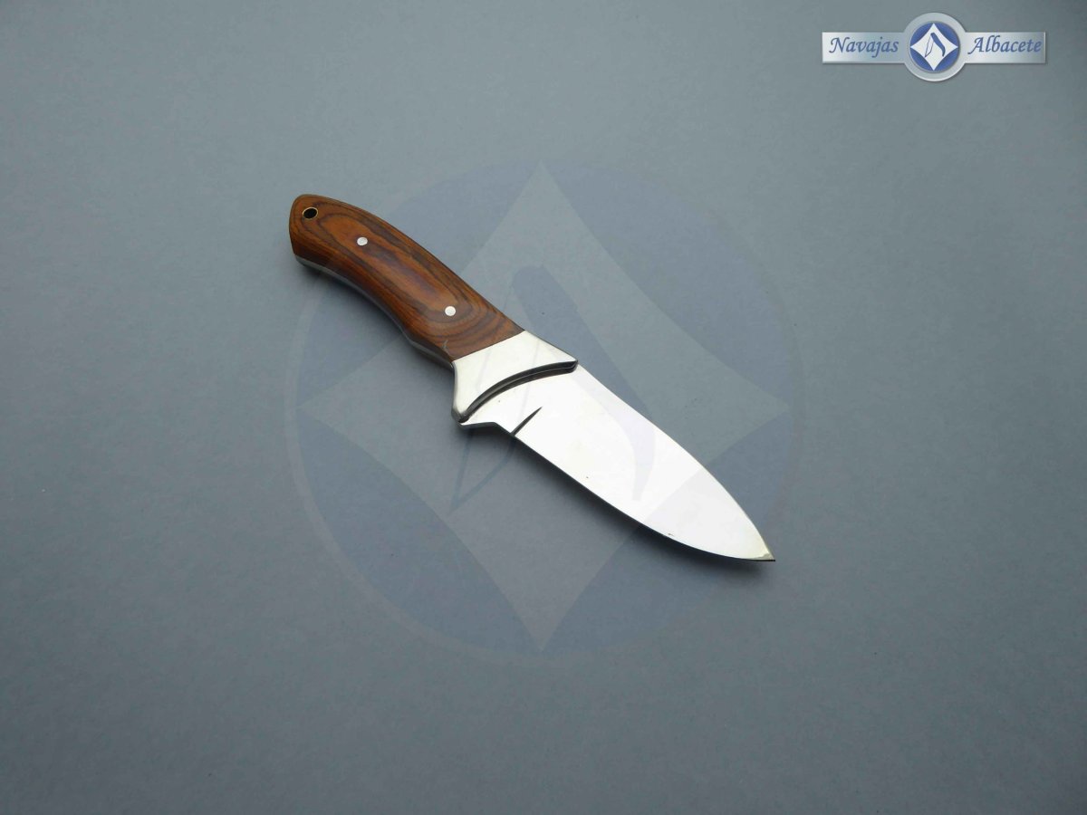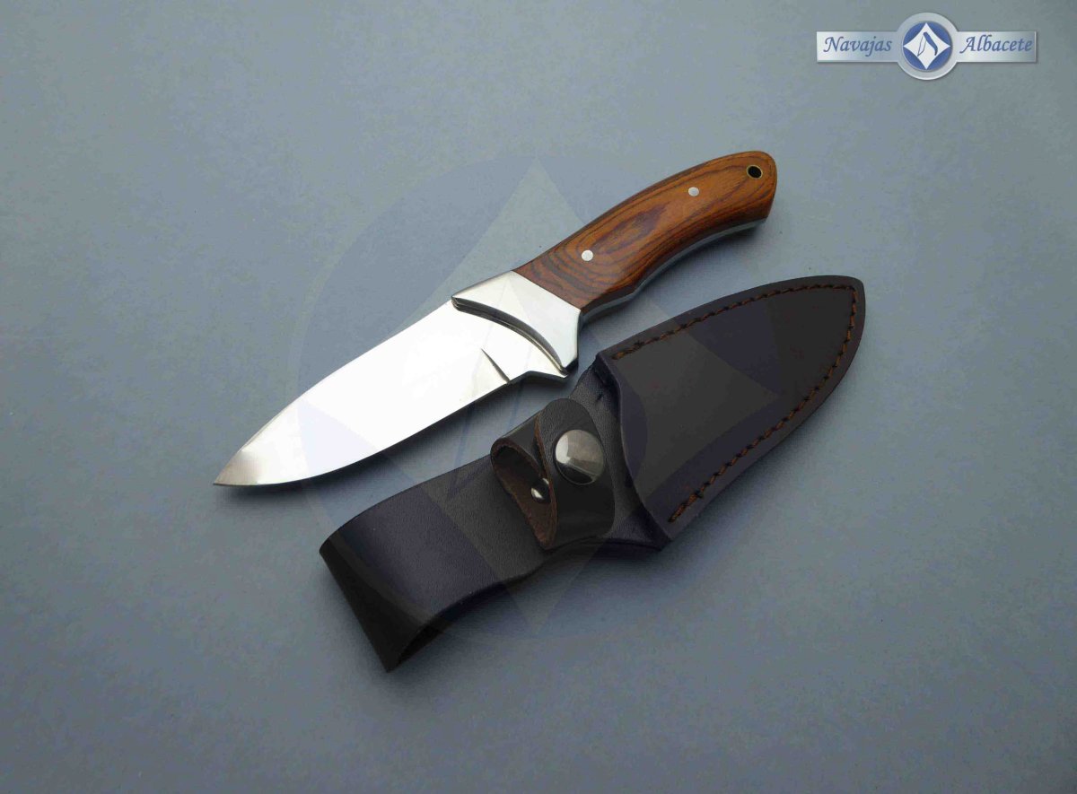 Descripción: Cuchillo deportivo con mango de madera estamina roja, virola de acero. Agujero en el pomo para pasar un cordón. Hoja de acero inoxidable molibdeno vanadio, acabado espejo. Incluye funda de piel con clip de seguridad y trabilla para cinturón.