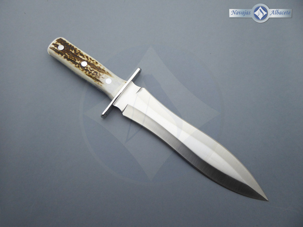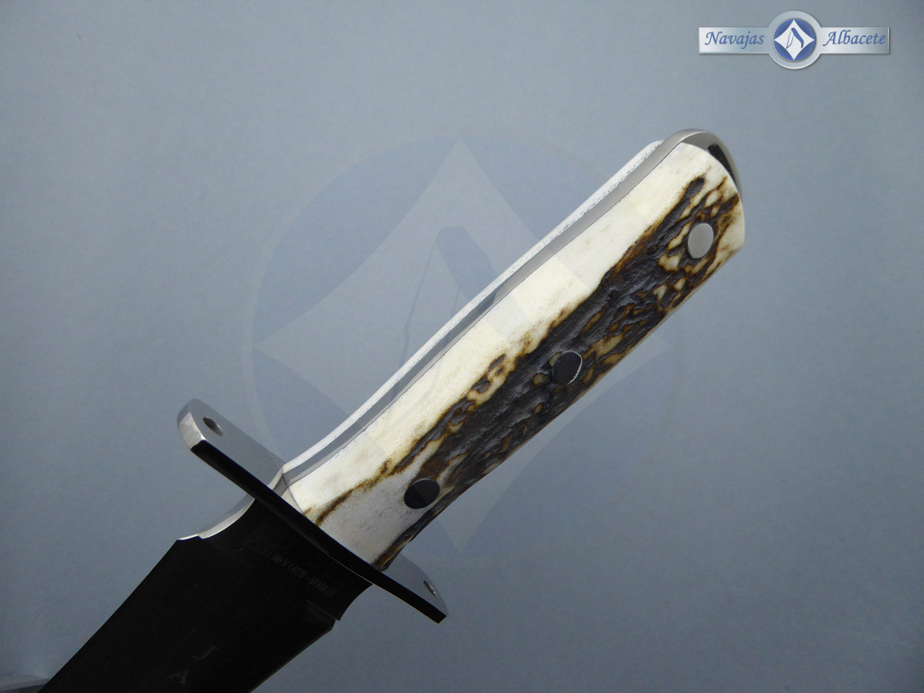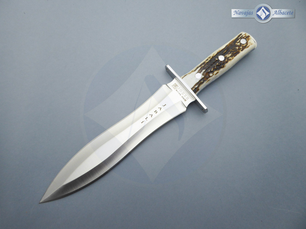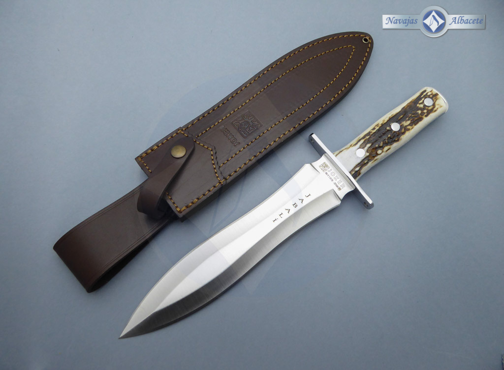 Descripción: Cuchillo de caza «Jabalí» de la prestigiosa marca albaceteña Joker, con mango en asta de ciervo y ojal de acero en el pomo. Cruceta acero inoxidable. Hoja de acero molibdeno vanadio de gran resistencia y durabilidad. Incluye funda de cuero color marrón con clip de seguridad y trabilla para cinturón. Diseñado y fabricado en Albacete.