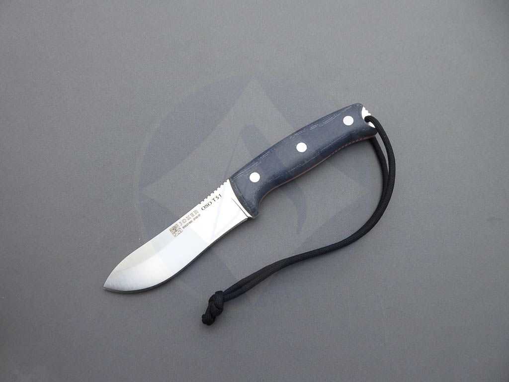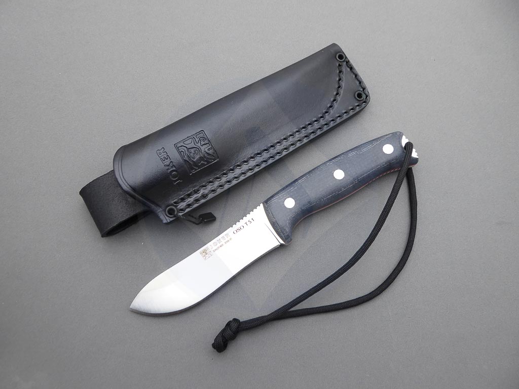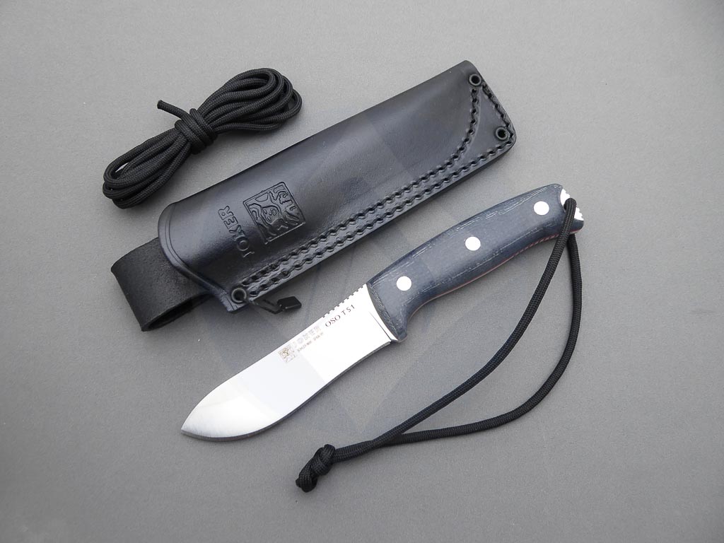 Descripción: Cuchillo de supervivencia y Bushcraft «Oso TS1» con mango de Jute micarta negro. Hoja enteriza de acero inoxidable Böhler N695 de gran resistencia y dureza. Incluye funda de piel color negro de gran calidad con costura de alta resistencia. Este cuchillo es robusto y versátil, ideal no solo para supervivencia sino también para la caza y otras actividades al aire libre. Hecho a mano en Albacete.