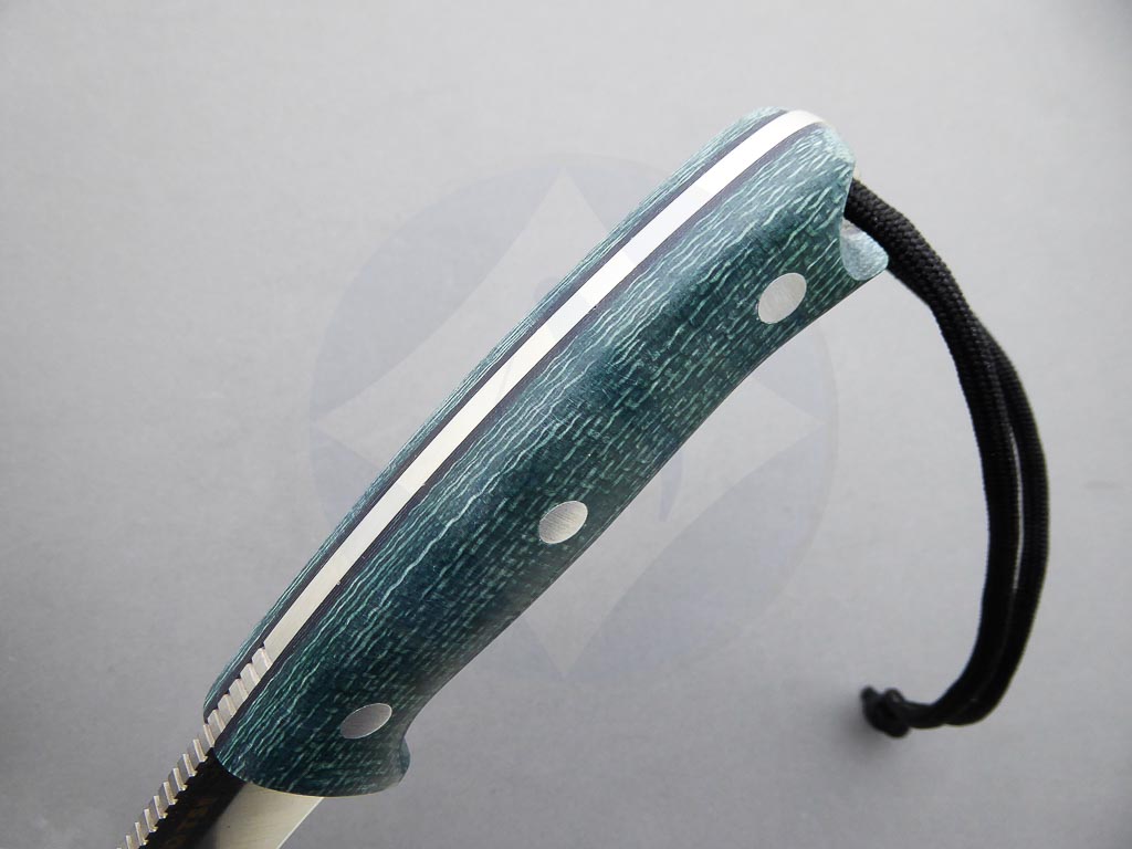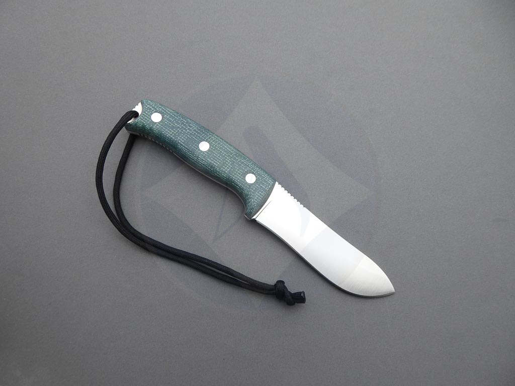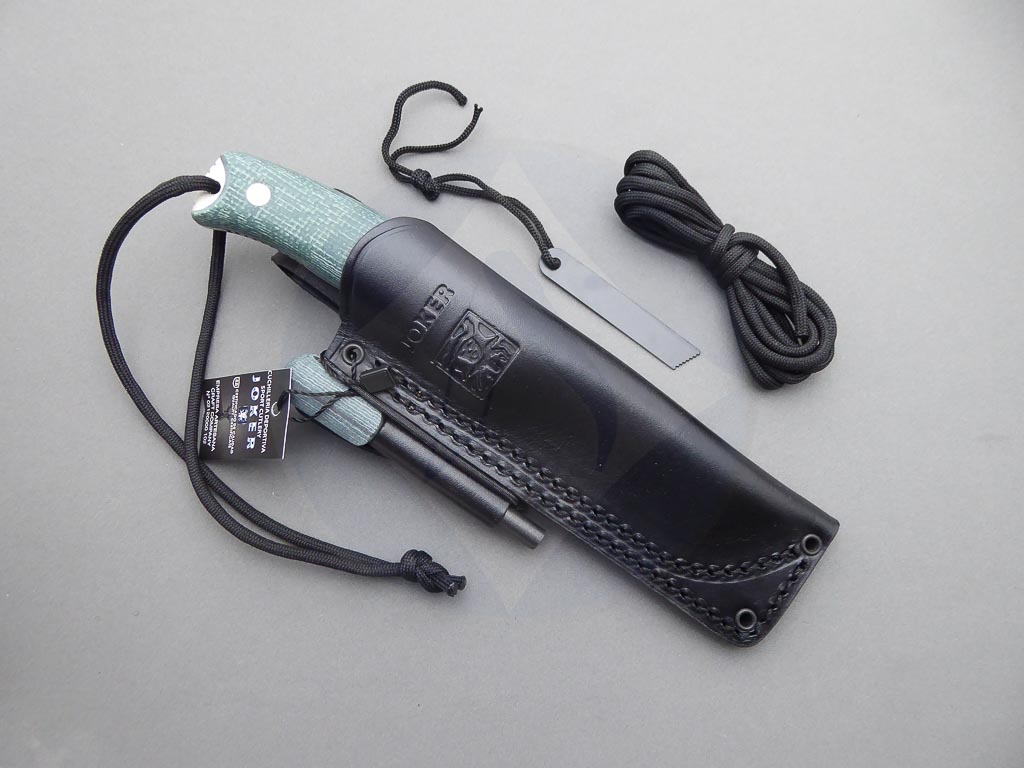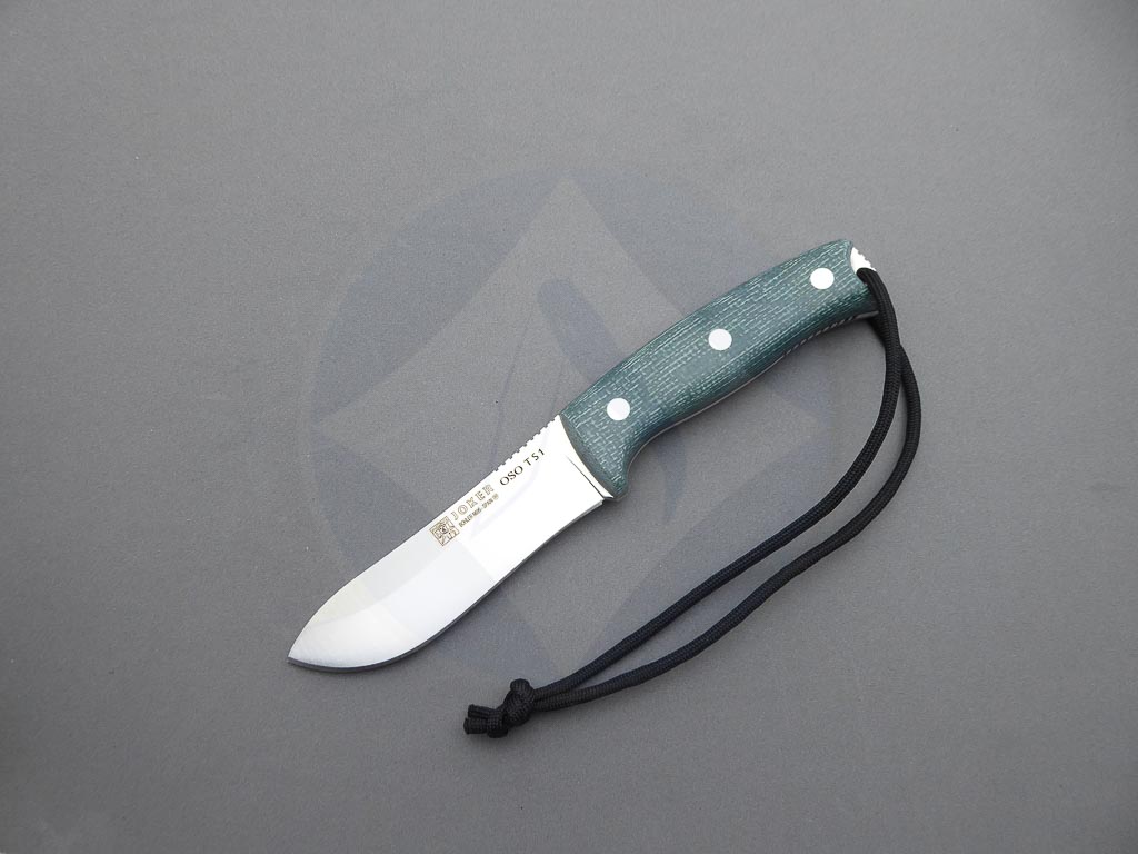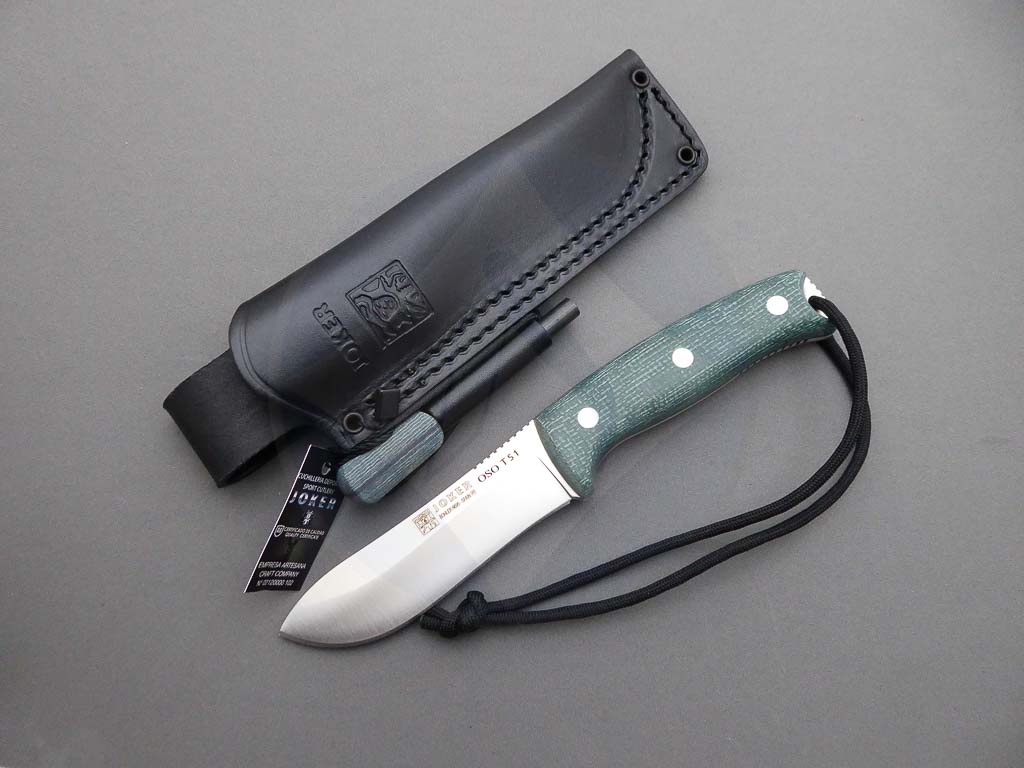 Descripción: Cuchillo de supervivencia y Bushcraft «Oso TS1» con mango de Jute micarta verde con separador negro. Hoja enteriza de acero inoxidable Böhler N695 de gran resistencia y dureza. Incluye funda de piel color negro de gran calidad con pedernal. Este cuchillo es robusto y versátil, ideal no solo para supervivencia sino también para la caza y otras actividades al aire libre. Hecho a mano en Albacete.