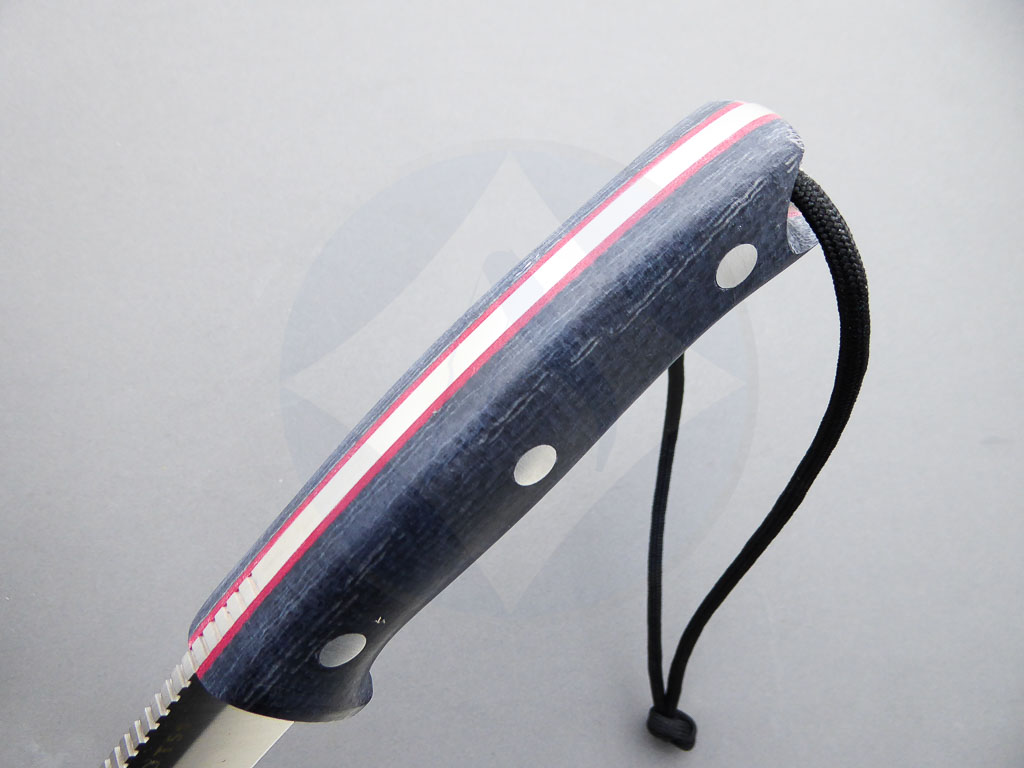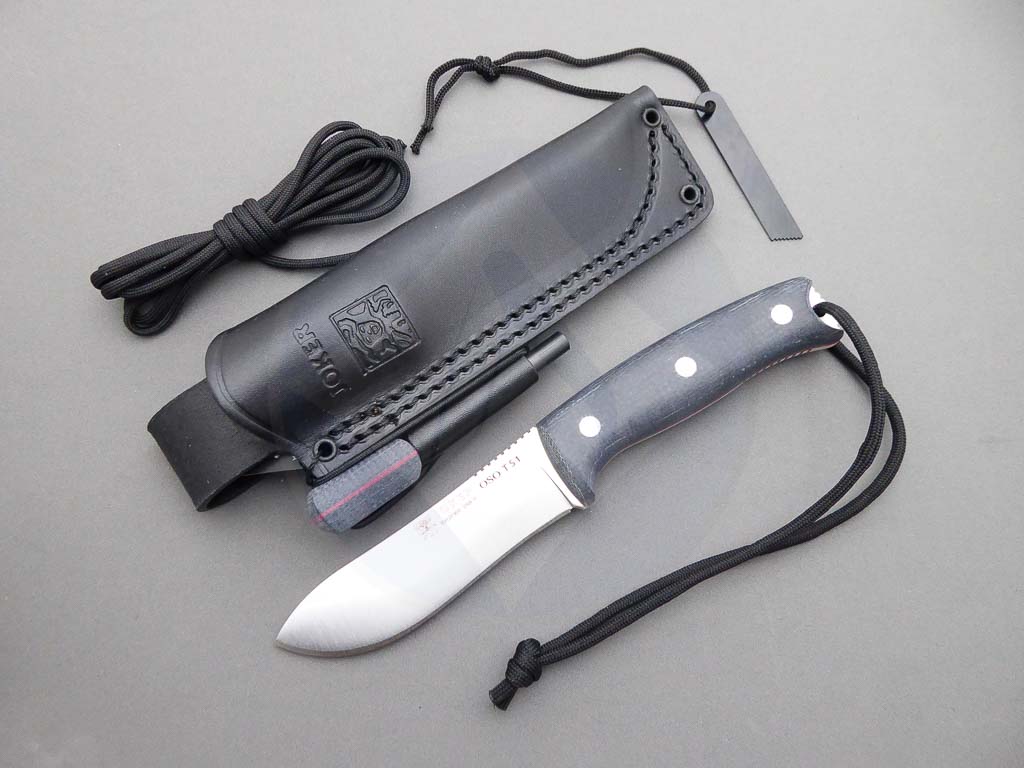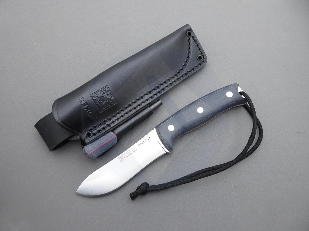 Descripción: Cuchillo de supervivencia y Bushcraft «Oso TS1» con mango de Jute micarta negro con separador rojo. Hoja enteriza de acero inoxidable Böhler N695 de gran resistencia y dureza. Incluye funda de piel color negro de gran calidad y un práctico ferrocerio. Este cuchillo es robusto y versátil, ideal no solo para supervivencia sino también para la caza y otras actividades al aire libre. Hecho a mano en Albacete.