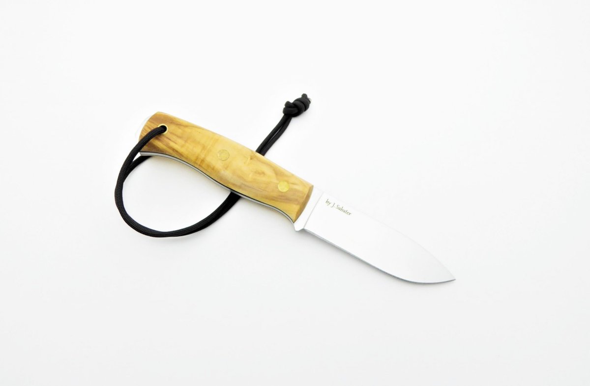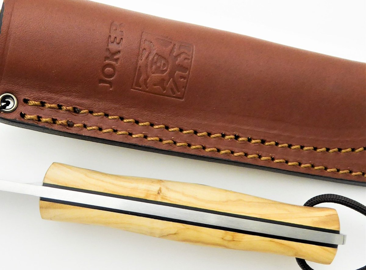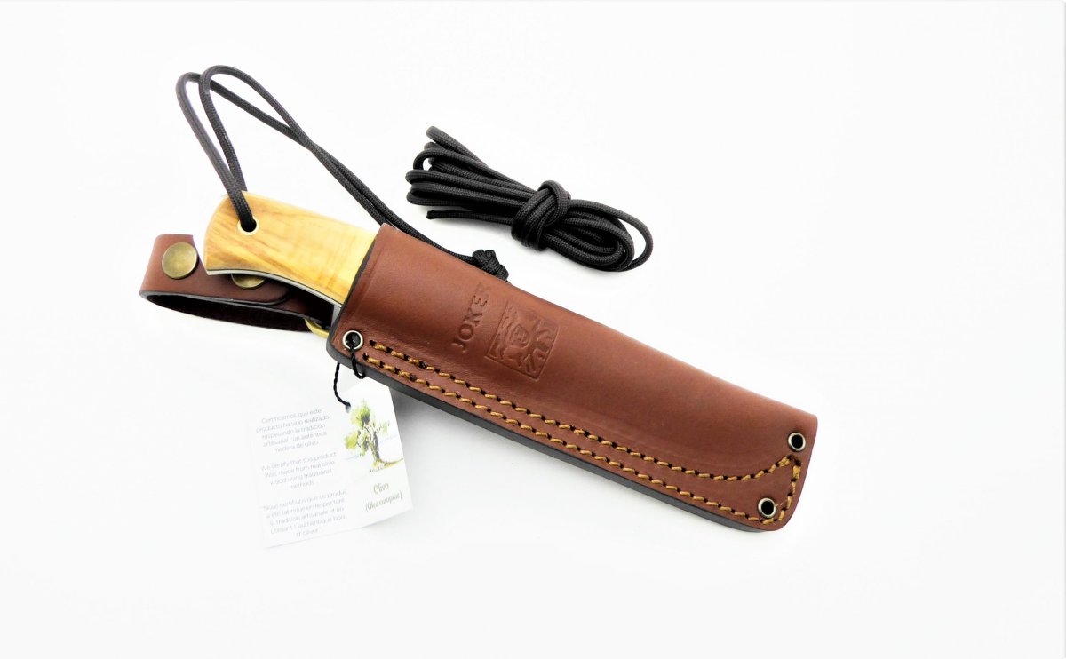 Descripción: «Ember F» Cuchillo de monte con puño de madera de olivo tratada artesanalmente con separador negro. Hecho a mano en Albacete. Hoja de acero Sandvik 14C28N de alta resistencia y durabilidad. Funda en cuero marrón de primera calidad, incluida con cordón para una mejor sujeción a la pierna.