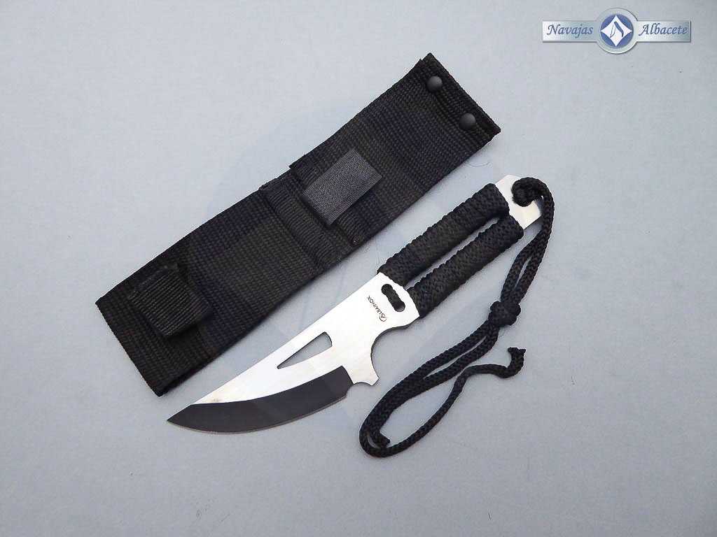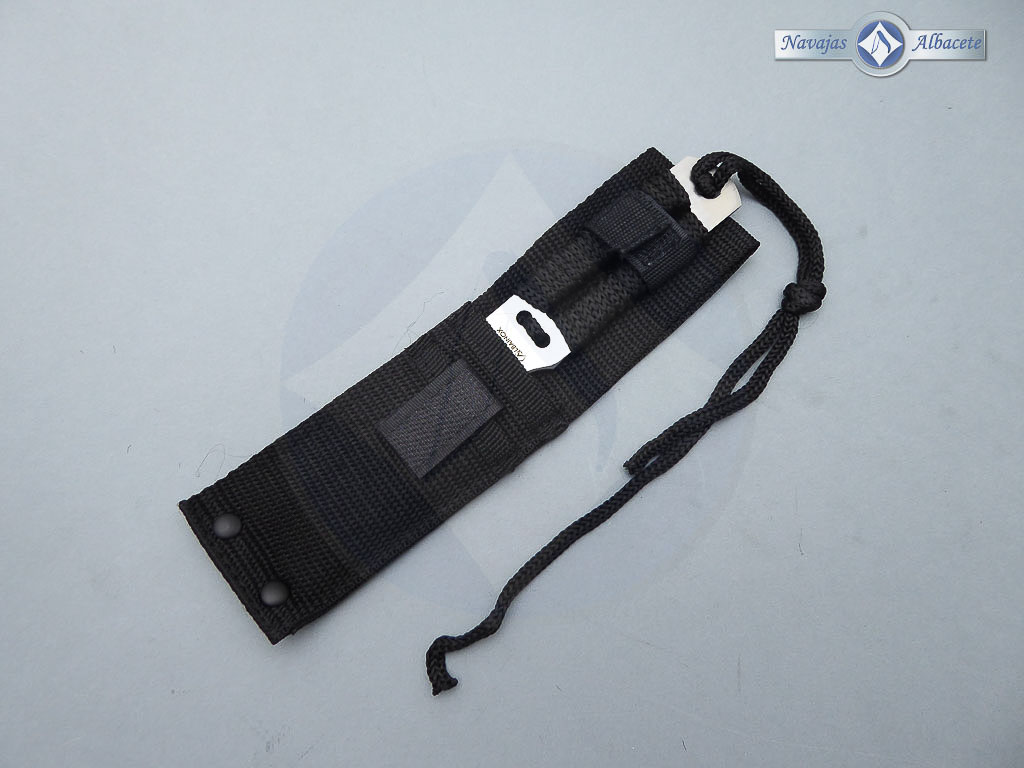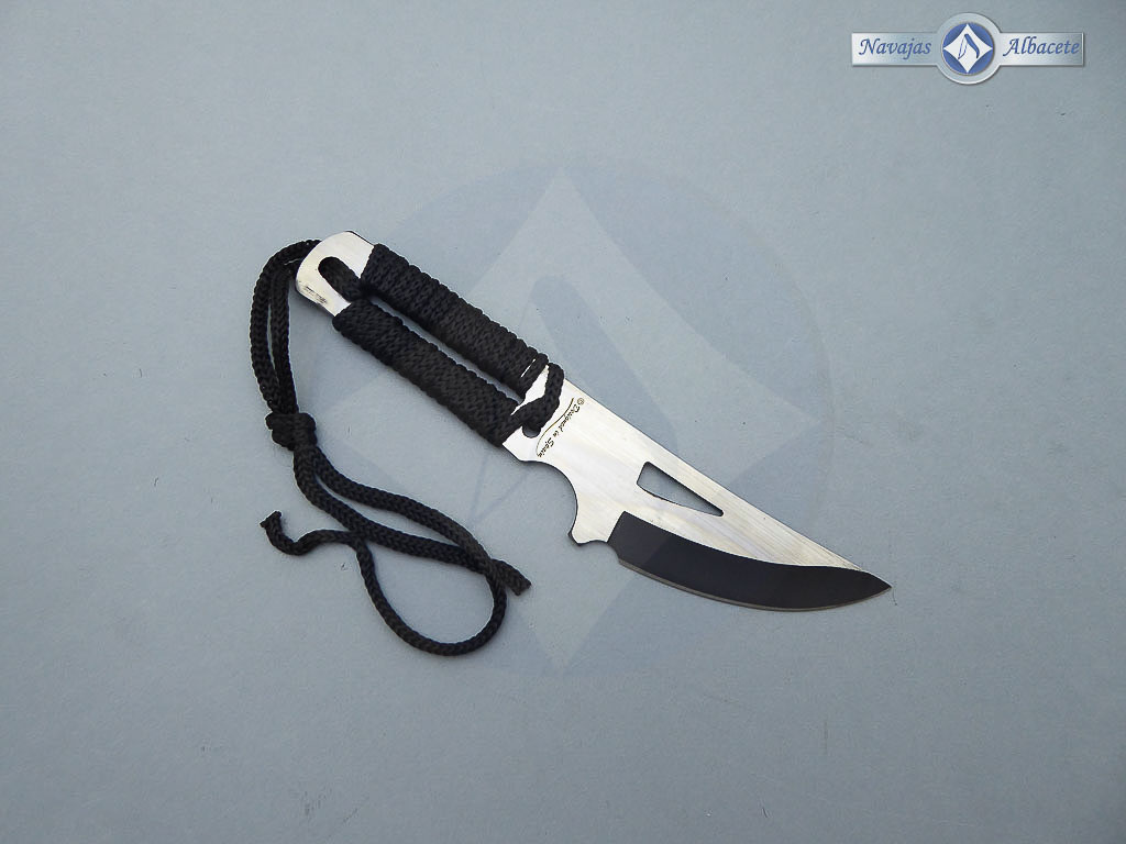 Descripción: Cuchillo táctico con mango de acero encordado color negro. Hoja enteriza calada de acero inoxidable molibdeno vanadio, acabado satinado y negro. Incluye funda de nylon negro con velcro de seguridad. Diseñado en España.