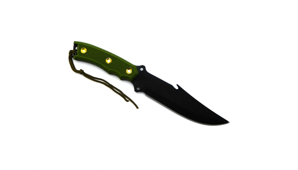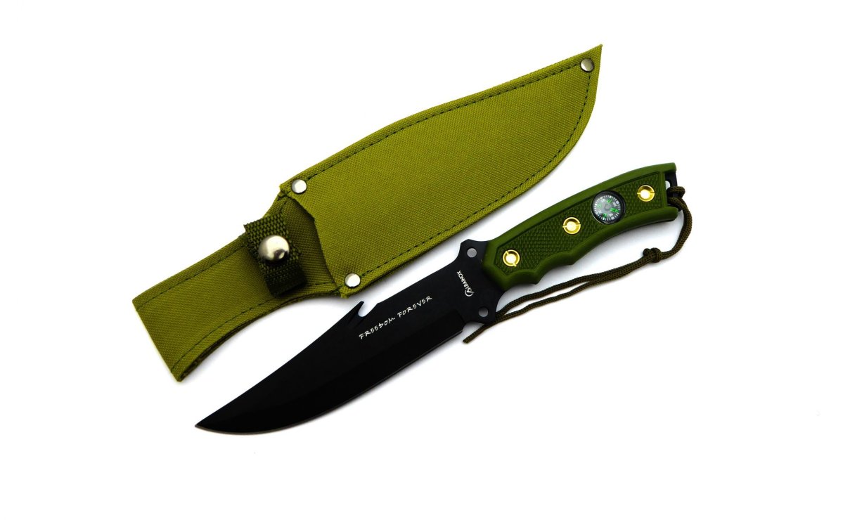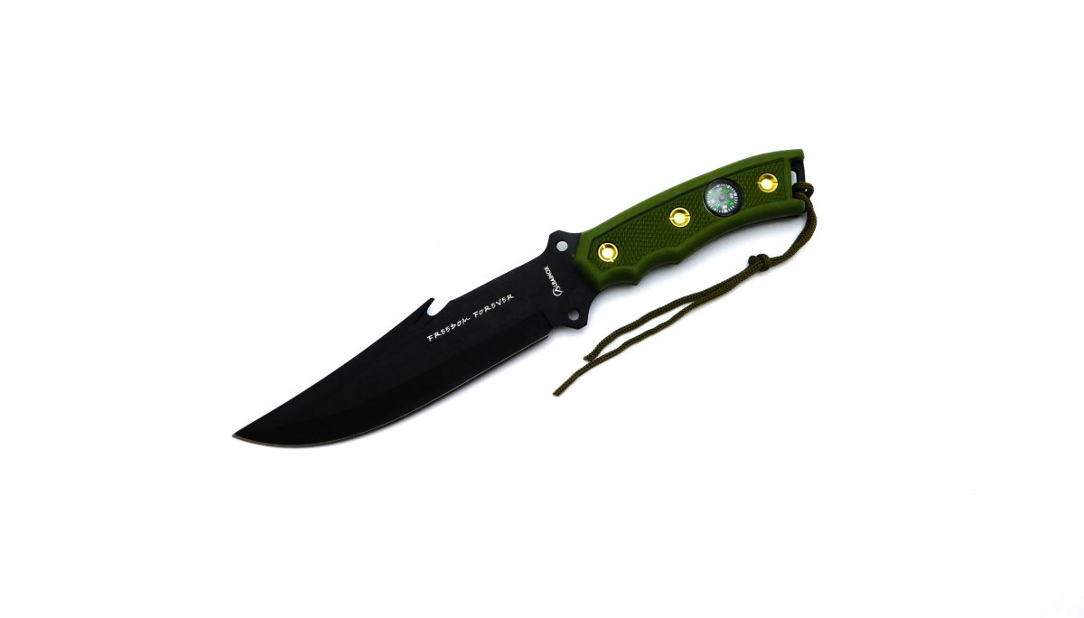 Descripción: Cuchillo Táctico FREEDOM FOREVER con mango en plástico ABS verde, con una pequeña brújula en el puño y un cordón. Hoja de acero inoxidable acabado negro. Incluye skinner y funda de nailon verde con clip de seguridad y trabilla para cinturón.