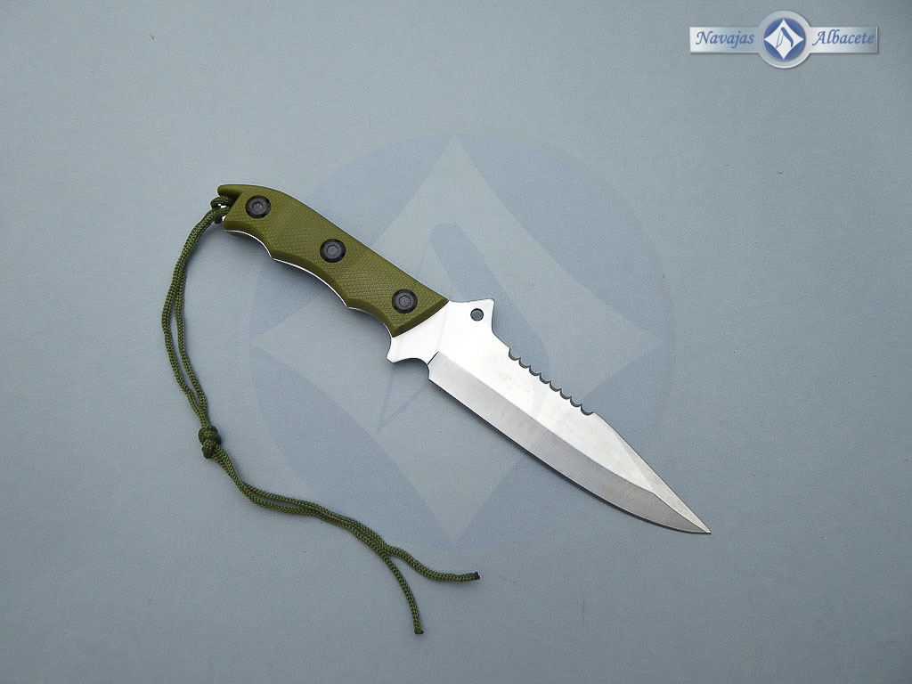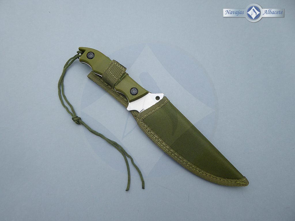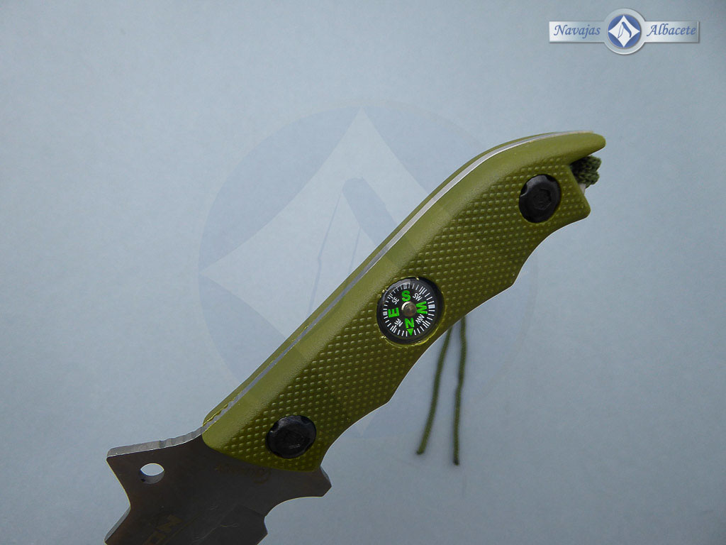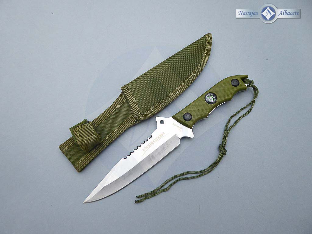 Descripción: Cuchillo táctico «Horizon» con puño de plástico ABS color verde, con pequeña brújula. Hoja enteriza de acero inoxidable molibdeno vanadio acabado satinado. Con cordón en el pomo. Incluye funda de nylon con trabilla para cinturón.