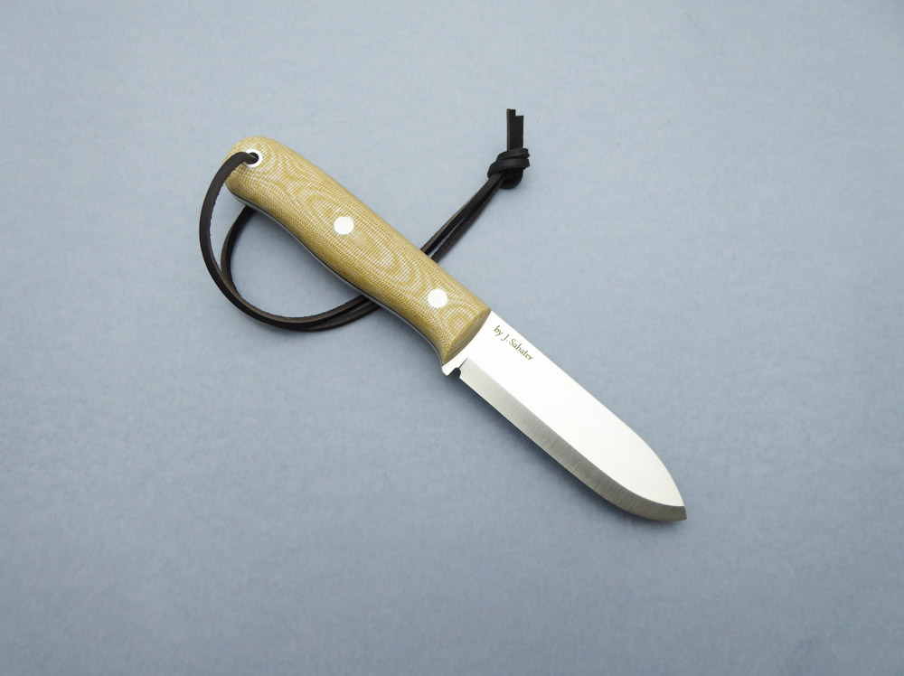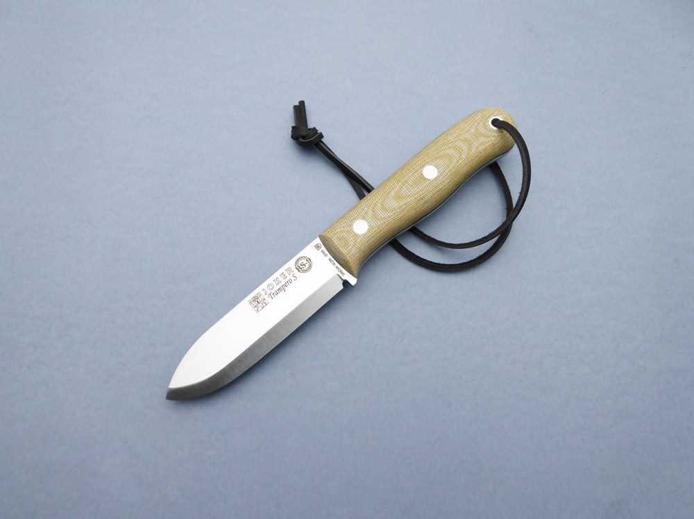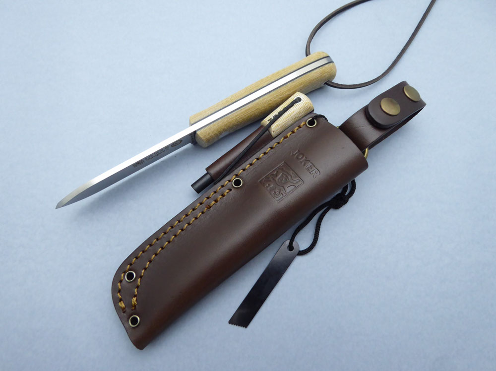 Descripción: «Trampero S» Cuchillo de monte Bushcraft con mango micarta beige con separador negro y cordón de cuero. Hecho a mano en Albacete. Hoja de acero sandvik 14C28N de alta resistencia y durabilidad. Incluye funda de piel marrón de primera calidad con trabilla para cinturón, portador de ferrocerio, pedernal artesanal a juego con el mango del cuchillo y rascador. Indicado para diferentes actividades como caza, pesca, supervivencia, camping, etc. Disponible en distintos acabados.