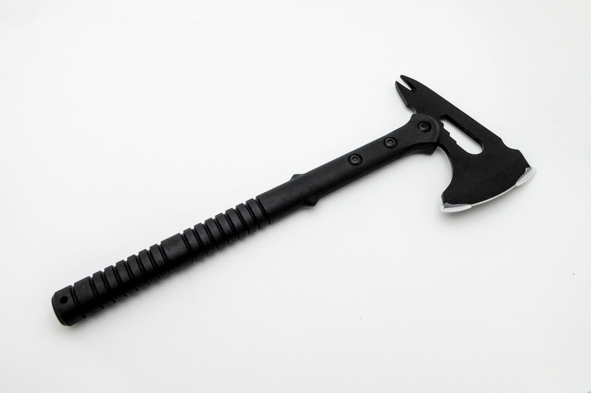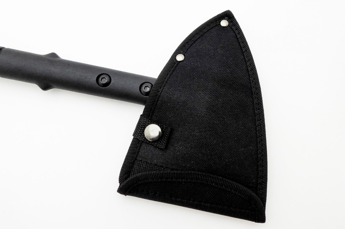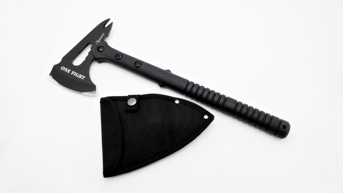 Descripción: Hacha de caza «One Fight» con puño en fibra de alta resistencia. Hoja de acero inoxidable calada molibdeno vanadio cromo acabado en negro, con ranura para aflojar tuercas y ranura sacaclavos. Funda en nailon negra con clips de seguridad y trabilla para cinturón.