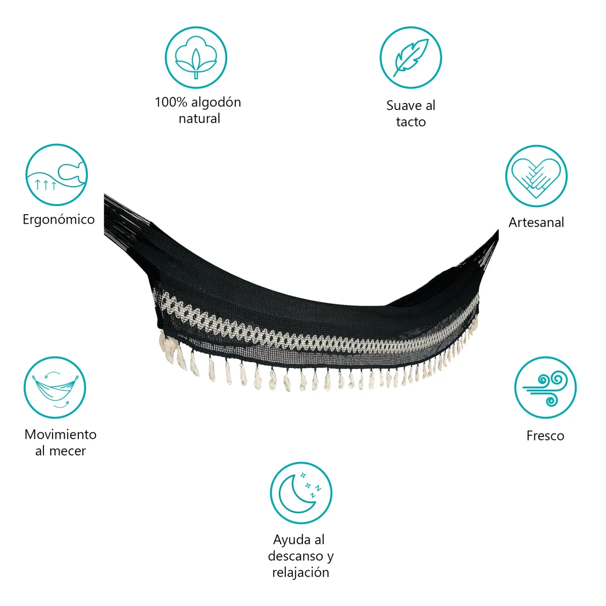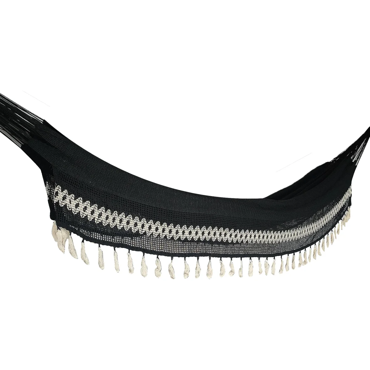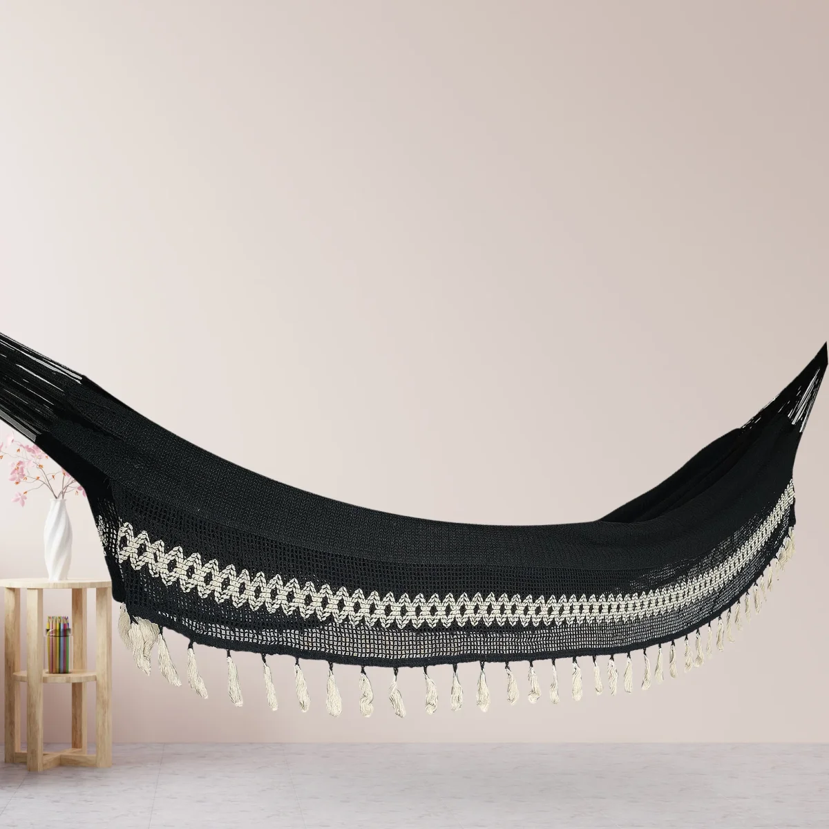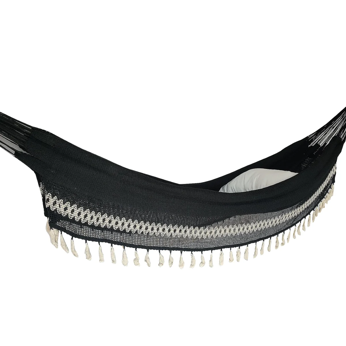 Hamaca de tela combinación de algodón y nailon tamaño grande con hermosos colgantes. Una hamaca para compartir; la más buscada por su tamaño, disfrútala con tu compañía favorita.