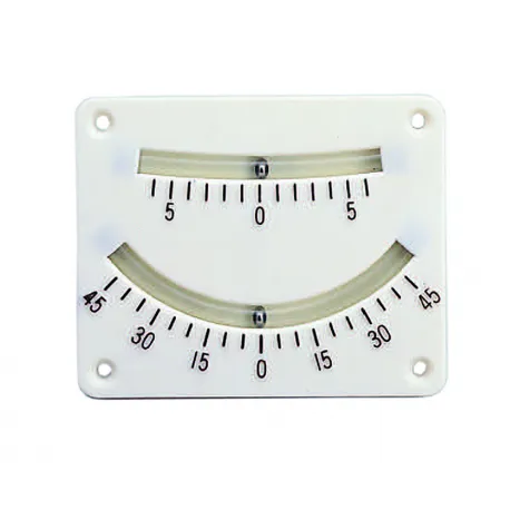 Inclinómetro de plástico con dos escalas de medida. Tamaño. 100 x 80 mm. Graduación 45° – 0 – 45°, graduación 5° – 0 – 5°