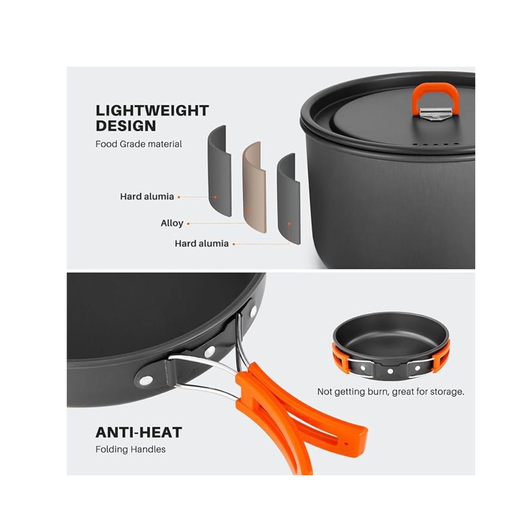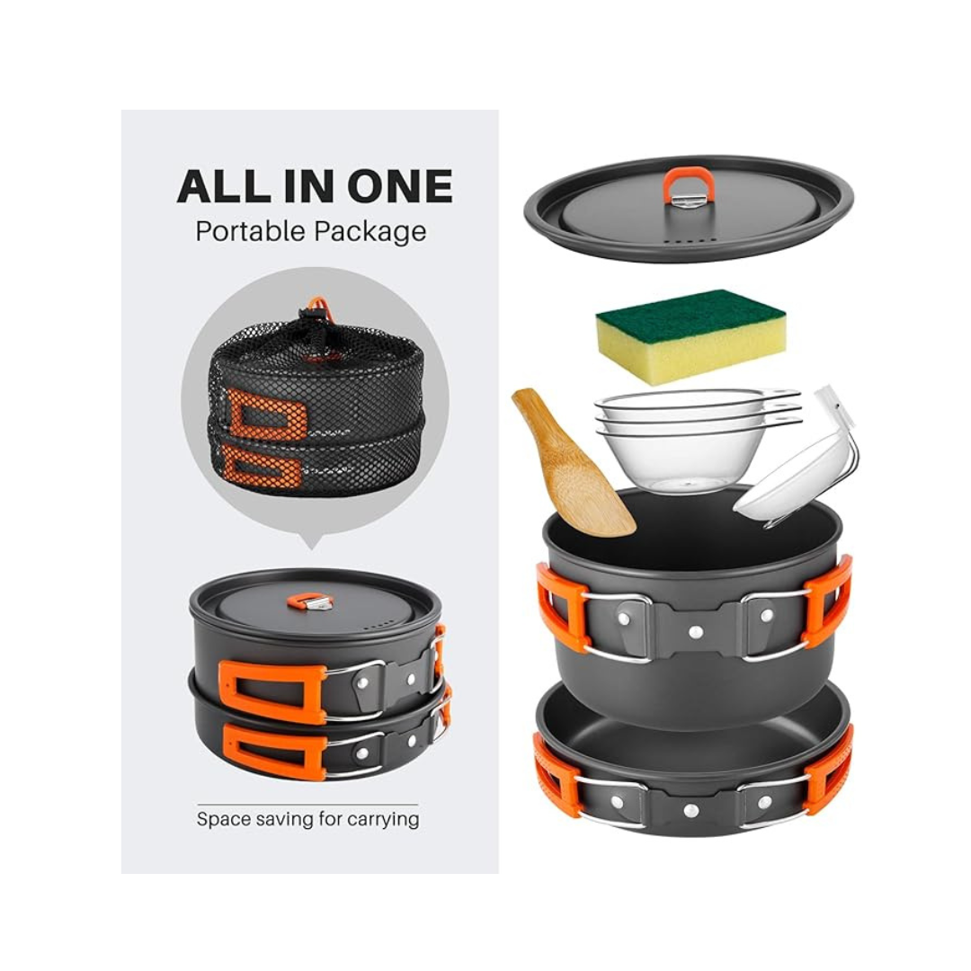 Juego de utensilios de cocina para acampar de 9 piezas, liviano y compacto, con ollas y sartenes antiadherentes, ideal para senderismo y actividades al aire libre.