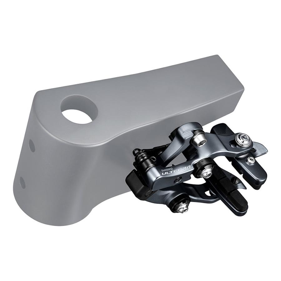 El puente de freno trasero Shimano Ultegra R8000 ofrece un diseño muy compacto, con espacios más estrechos entre los brazos. La holgura más amplia lo hace compatible con cubiertas de tamaños mayores (hasta 28C). El estabilizador entre los ejes reduce la deformación y mejora la eficiencia de frenado, ofreciendo una sensación de contacto clara con rigidez equilibrada, peso y gran poder de frenado.