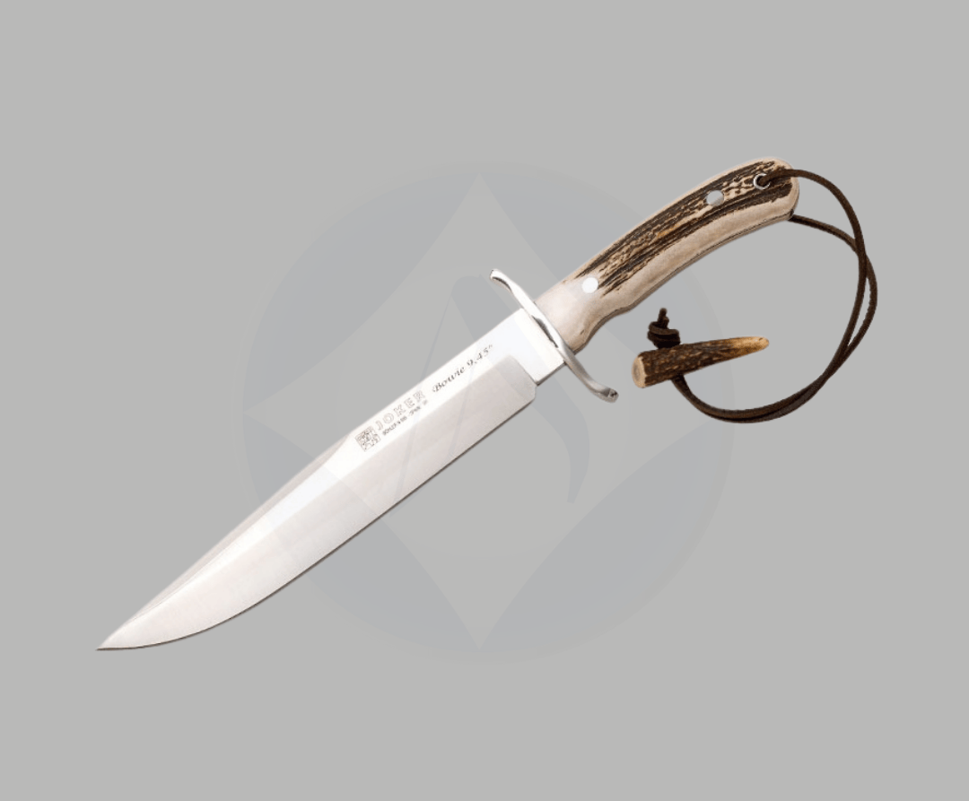Descripción: cuchillo de monte Bowie 9.45″ de la prestigiosa marca albaceteña Joker. Hoja enteriza de acero inoxidable Böhler N695 de gran resistencia y durabilidad. Grosor de hoja 5.5 mm. Guarda de acero inoxidable. Empuñadura de cuerno de ciervo, con cordón de cuero con punta de ciervo. Hecho a mano en Albacete. Incluye funda de cuero marrón de primera calidad con clip de seguridad de apertura rápida y trabilla para cinturón.