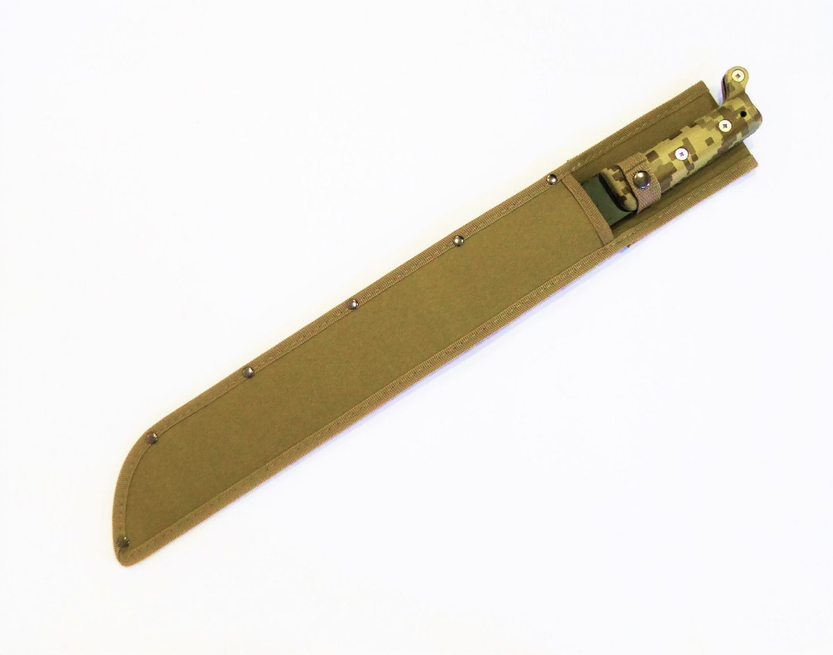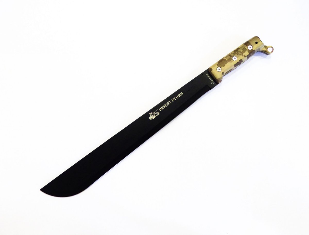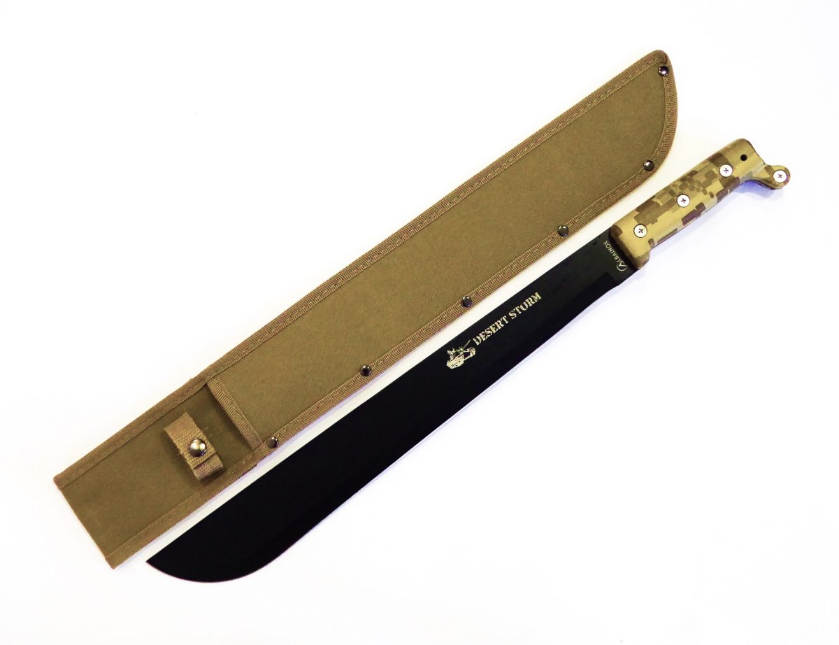 Descripción: Cortacañas DESERT STORM con mango en plástico ABS de gran calidad, acabado camuflaje árido pixel. Hoja de acero inoxidable molibdeno vanadio acabado negro, un solo filo. Incluye funda de nailon con clip de seguridad y trabilla para cinturón.