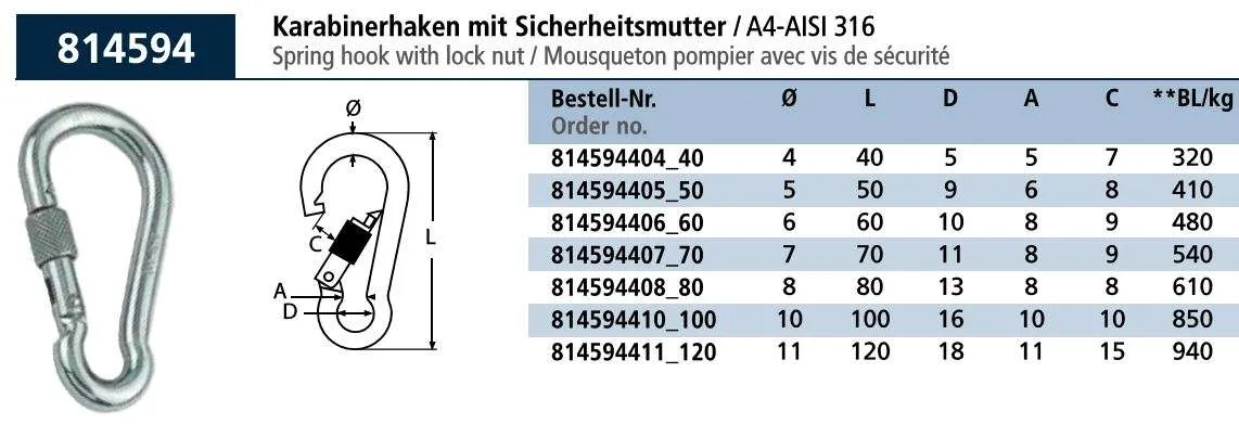 Mosquetón con Seguro inoxidable.