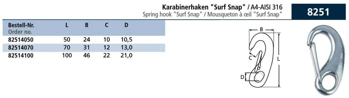 Mosquetón Gancho inoxidable. A4 AISI 316