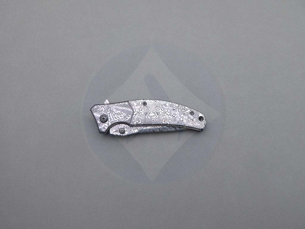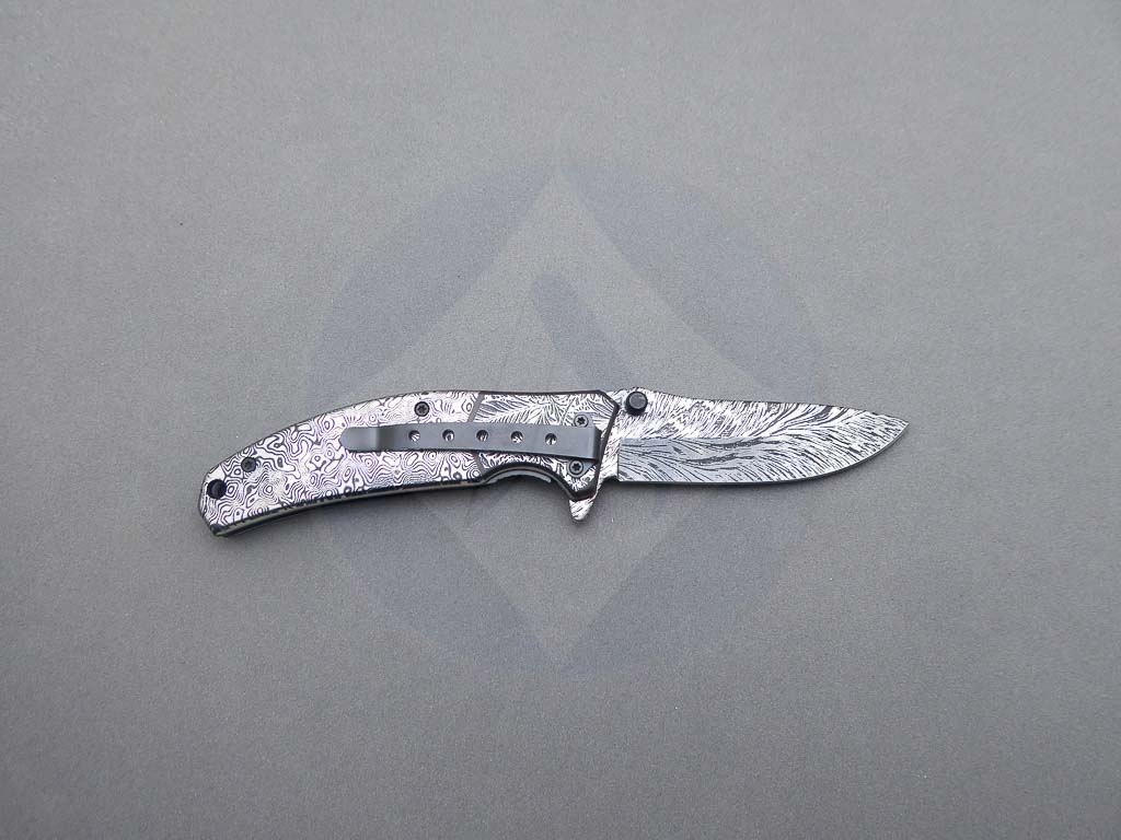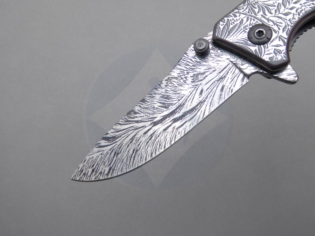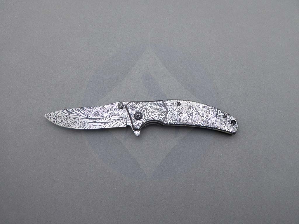 Descripción: Navaja con mango de acero decorado y hoja de acero inoxidable con decorado 3D. Sistema de bloqueo Liner Lock. Incluye clip trasero para cinturón.