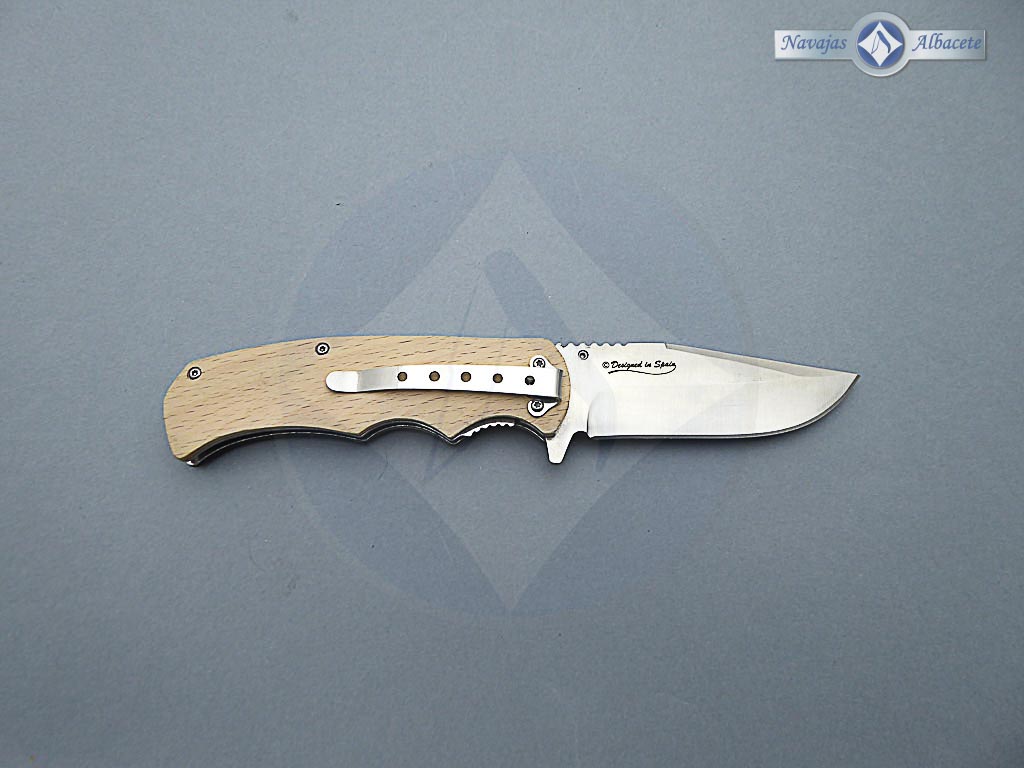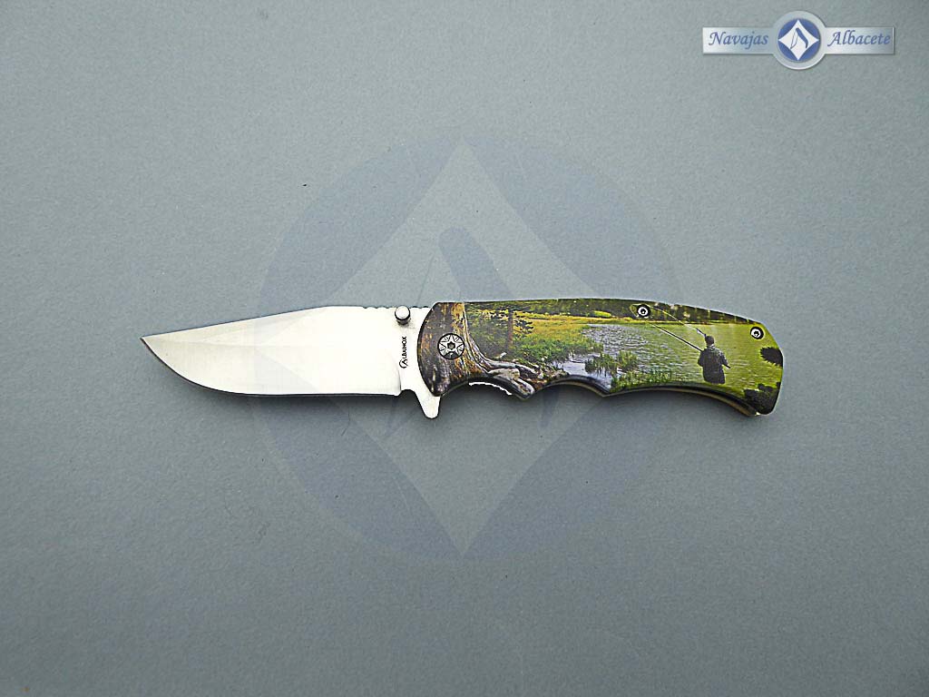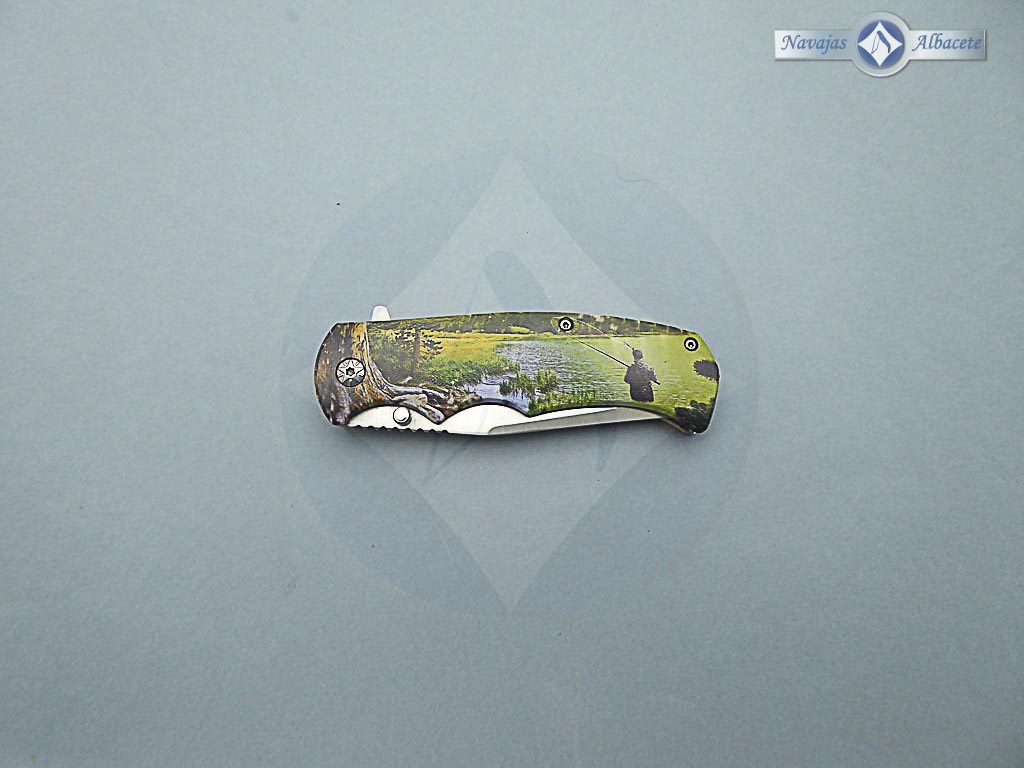 Descripción: Navaja 3D «Pesca» con mango de madera con impresión fotográfica 3D. Hoja de acero inoxidable acabado satinado. Clip porta cinturón, bloqueo de seguridad Liner lock. Diseñada en España.