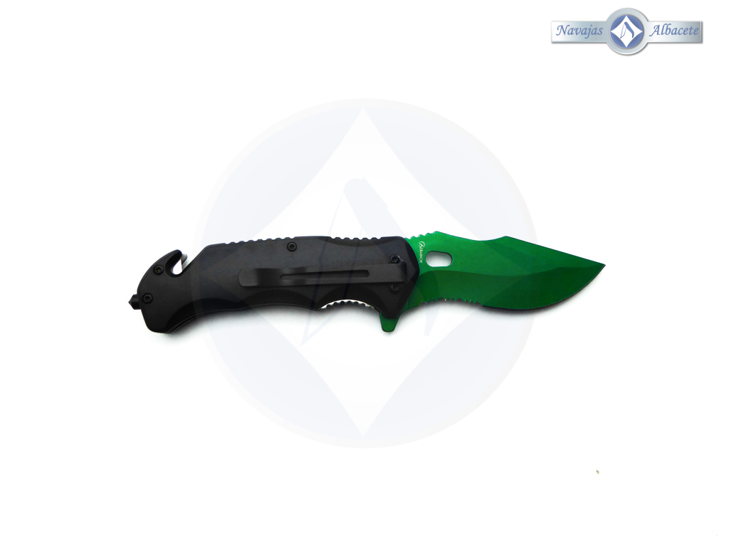 Descripción: Navaja táctica con mango en plástico ABS con impresión efecto 3D. Hoja en acero inoxidable molibdeno vanadio color verde, con sierra parcial en el filo. Punta rompecristales, clip porta cinturón, bloqueo de seguridad liner lock y cúter corta cinturón de una cuchilla. Últimas unidades.