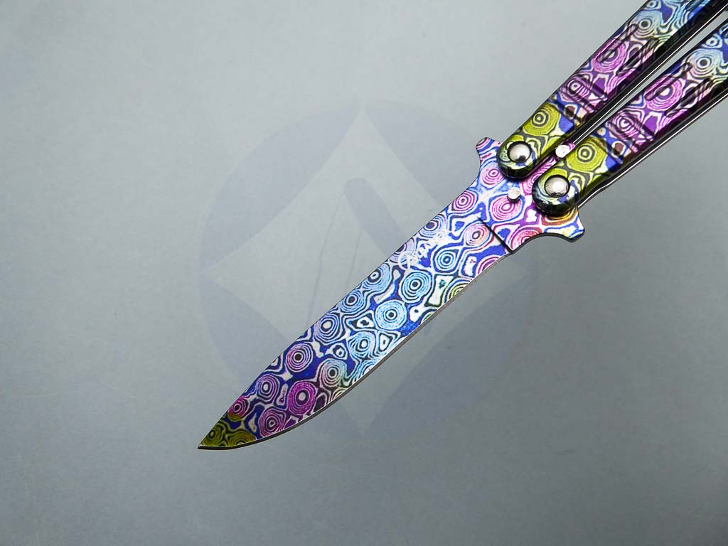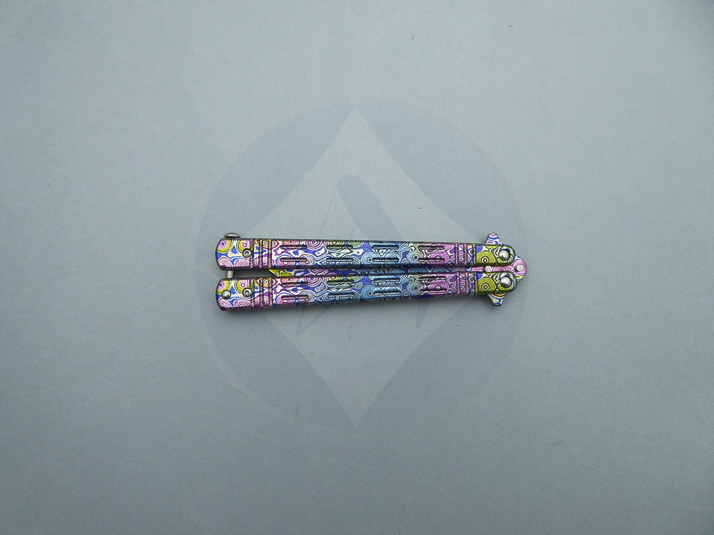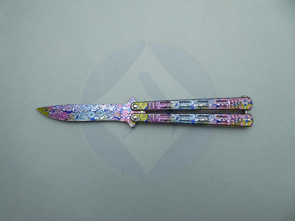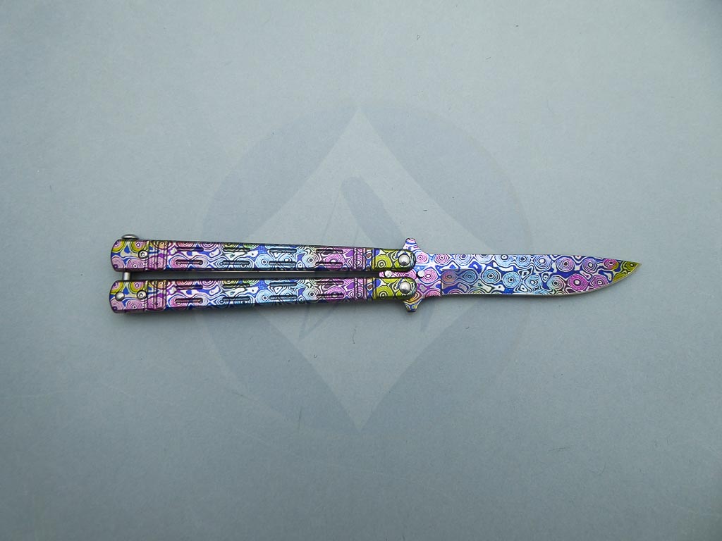 Descripción: Navaja abanico con mango de acero decorado con impresión en 3D damasco colorfull, a juego con la hoja de acero inoxidable molibdeno vanadio, también decorada. Bloqueo en pomo.