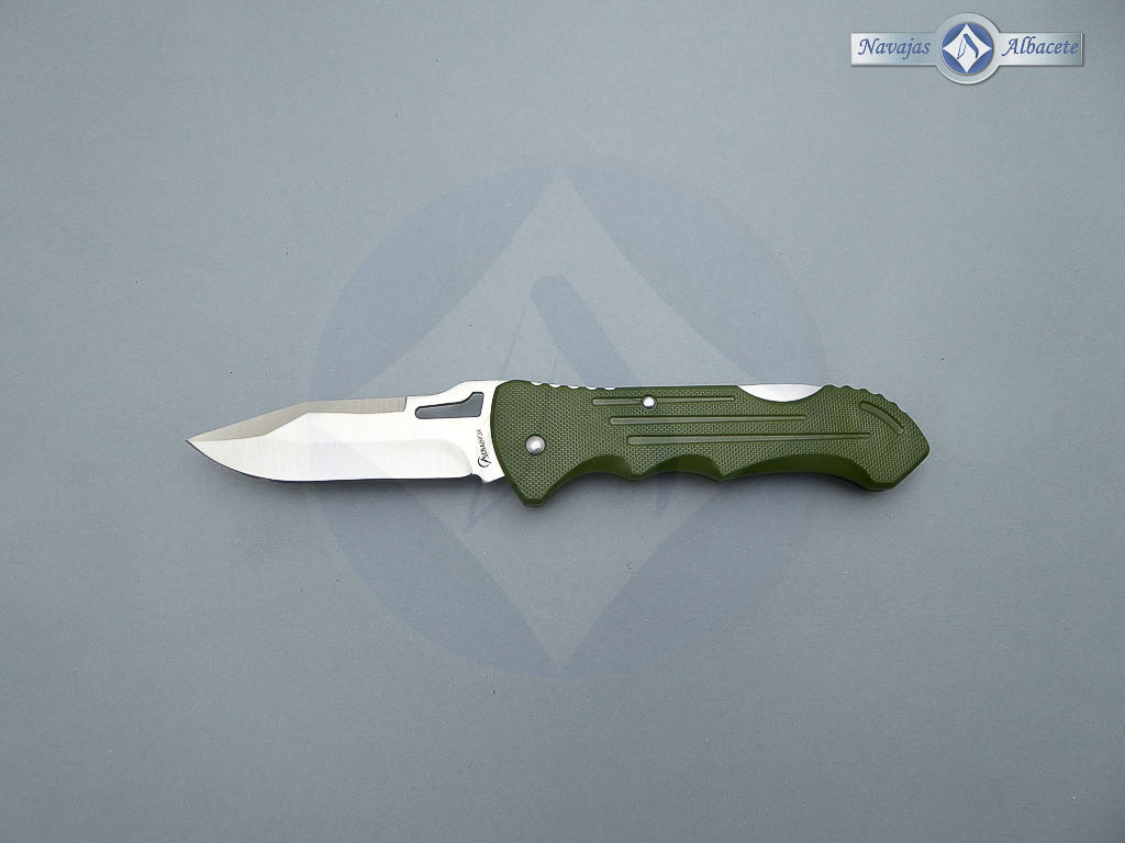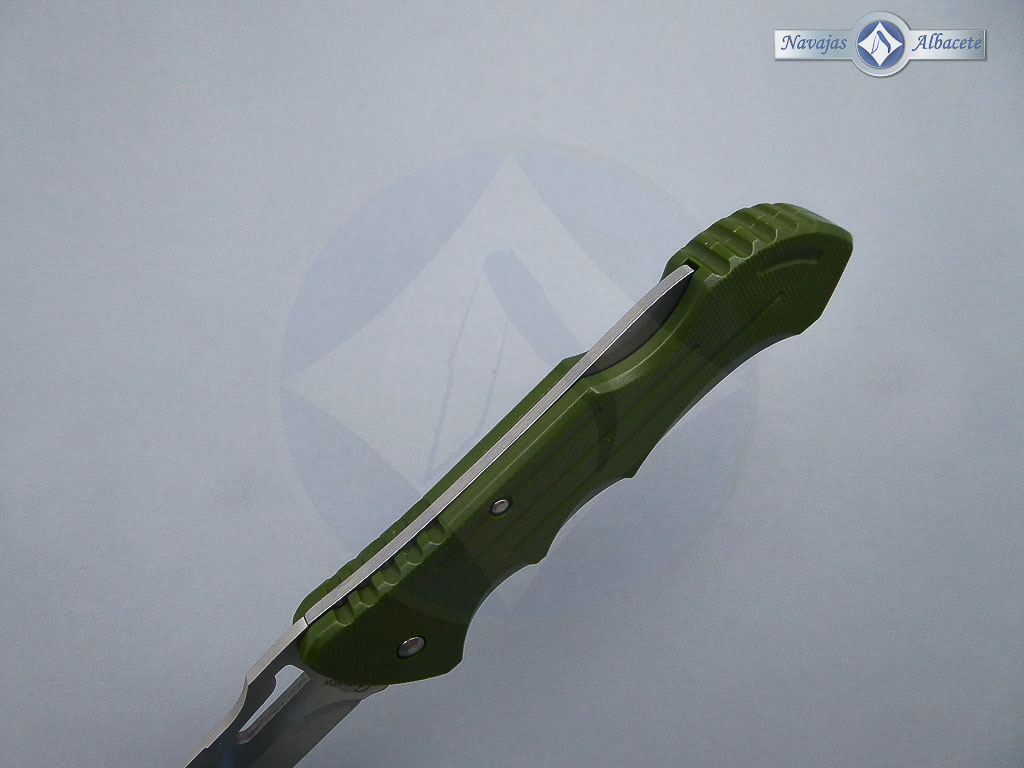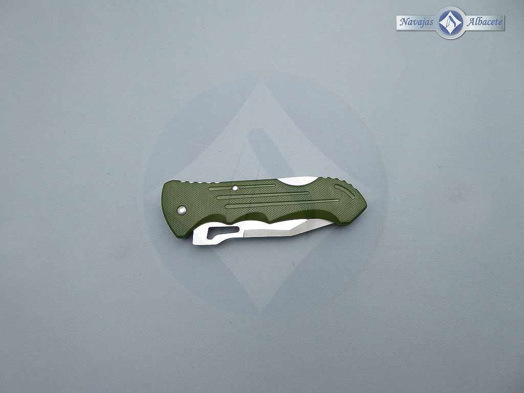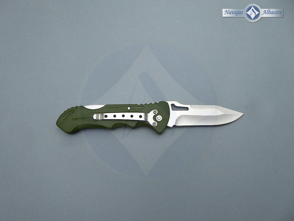 Descripción: Navaja con mango de plástico ABS color verde, con clip trasero para cinturón. Hoja de acero inoxidable molibdeno vanadio calada de 8 cm. Sistema de bloqueo back lock. Muy ligera.