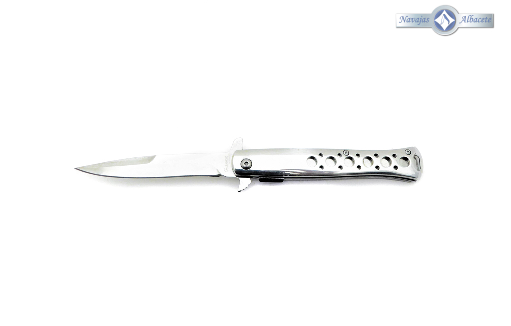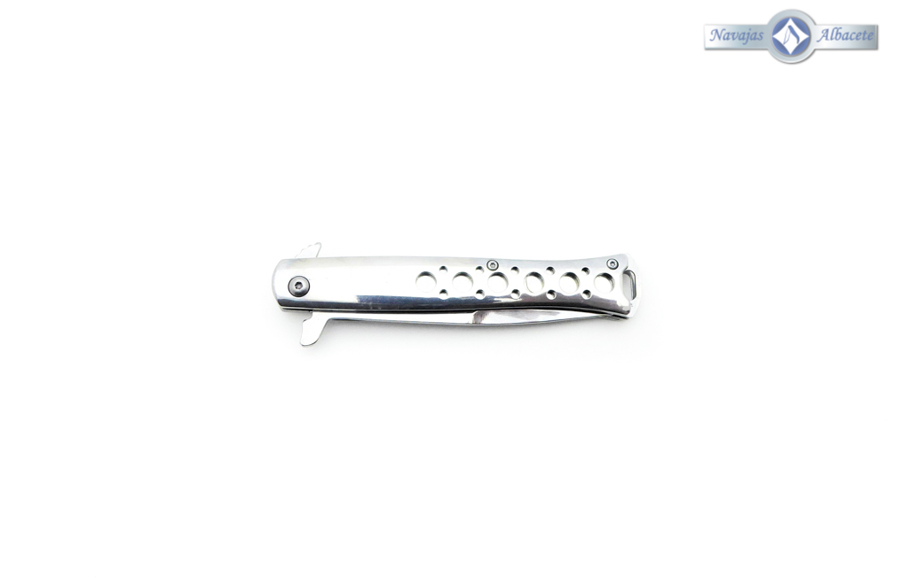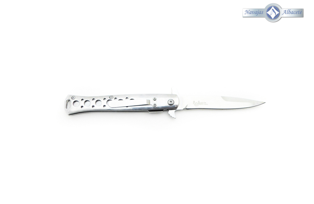 Descripción: Navaja estilete con mango de aluminio. Hoja en acero inoxidable molibdeno vanadio acabado espejo. Clip porta cinturón, bloqueo de seguridad linear lock.