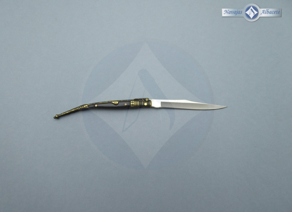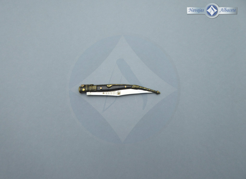 Descripción: Navaja estilete artesanal con puño de ABS negro y zamak decorado envejecido, muy ligera. Hecha a mano en Albacete. Hoja de acero inoxidable 420. El muelle es de pistón. Disponible en varios acabados.