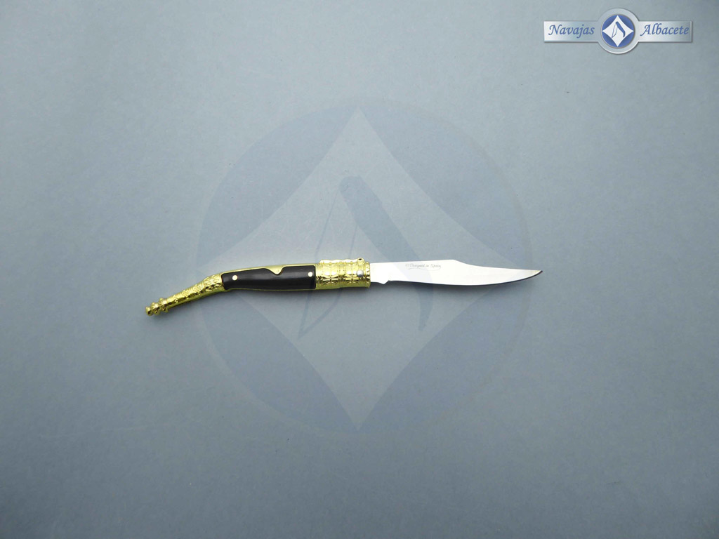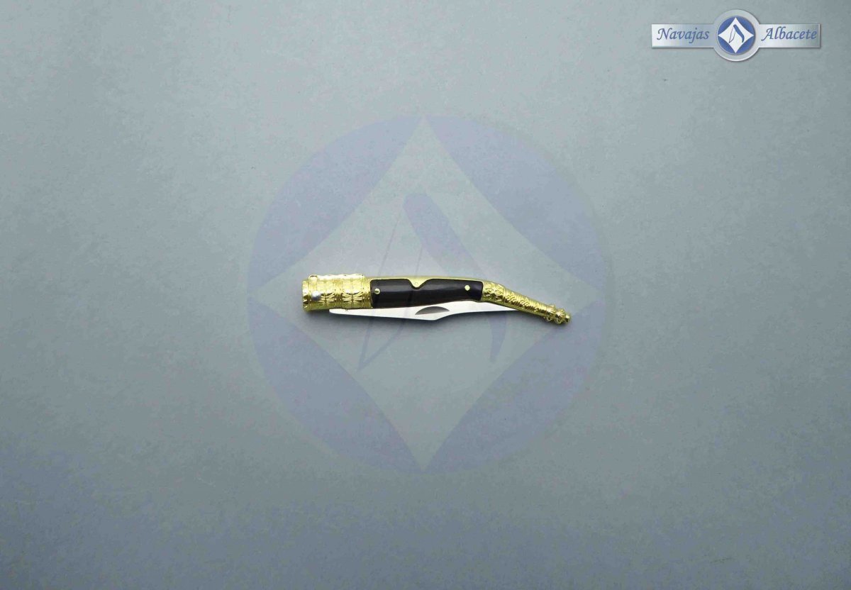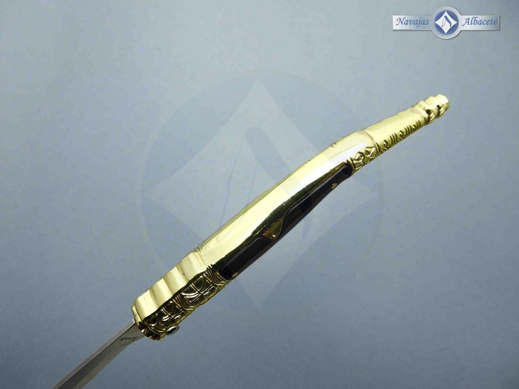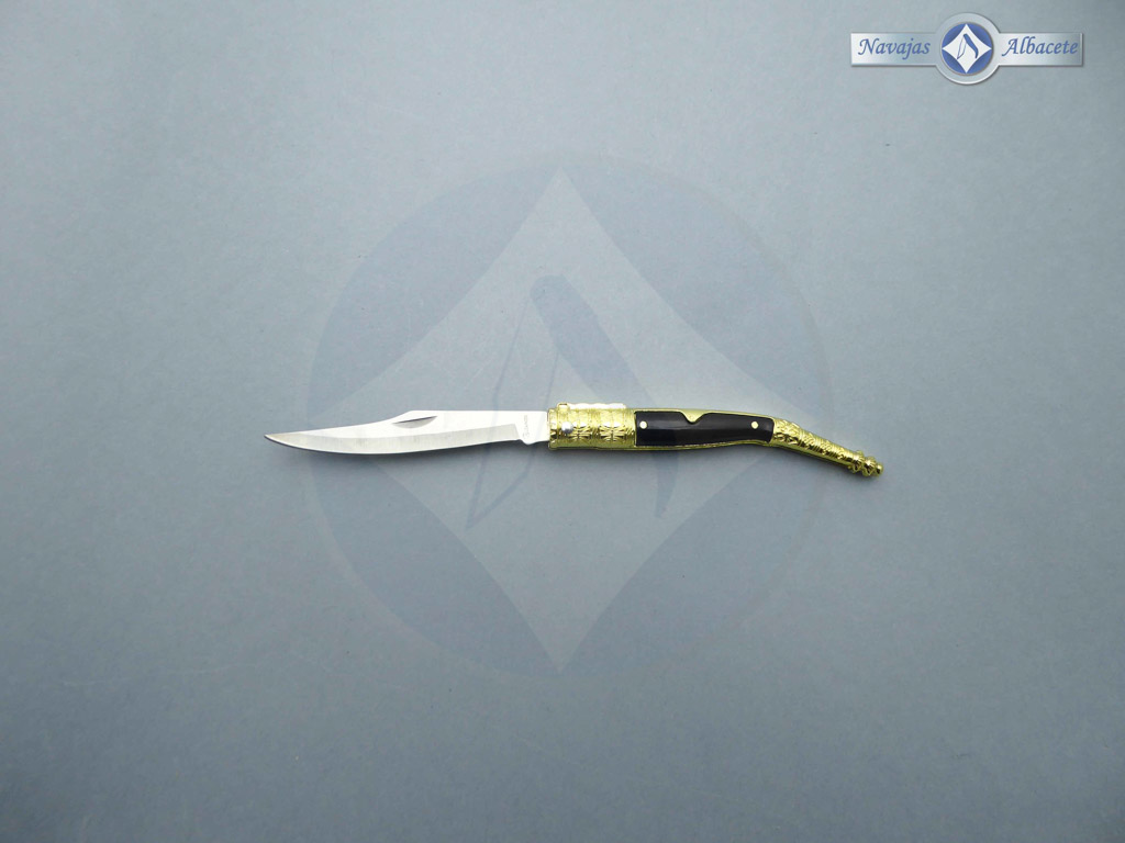 Descripción: Navaja decorada estilo árabe con mango de plástico ABS negro, virola y rebajo de zamak decorado color dorado. Hoja de acero inoxidable, con uña para su fácil extracción. Bloqueo de pistón. Diseñada en España.