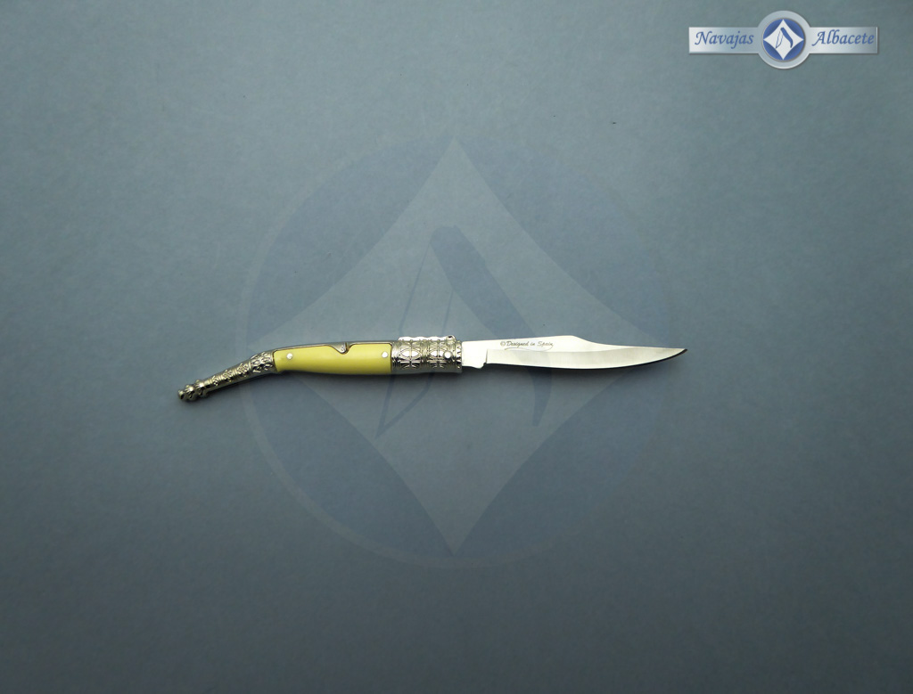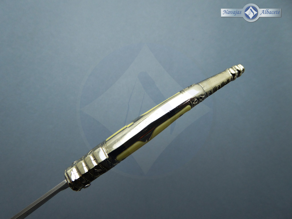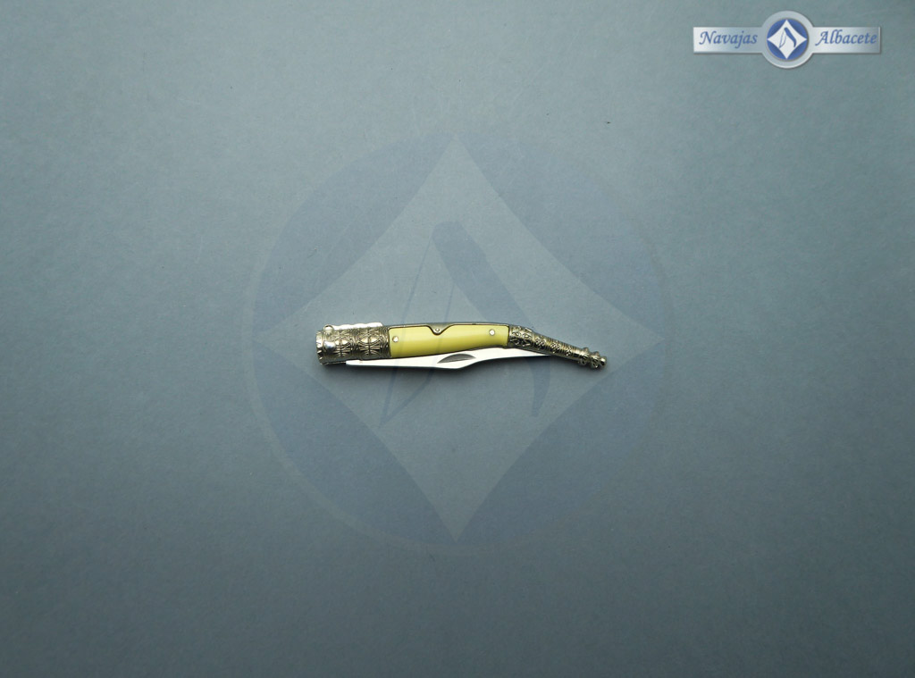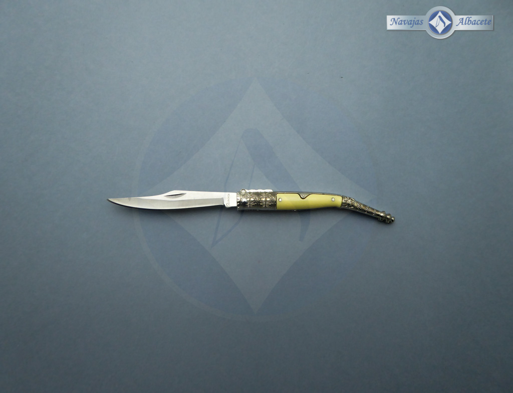 Descripción: Navaja decorada estilo árabe con mango de plástico ABS blanco, virola y rebajo de zamak decorado color plata. Hoja de acero inoxidable, con uña para su fácil extracción. Bloqueo de pistón. Diseñada en España.