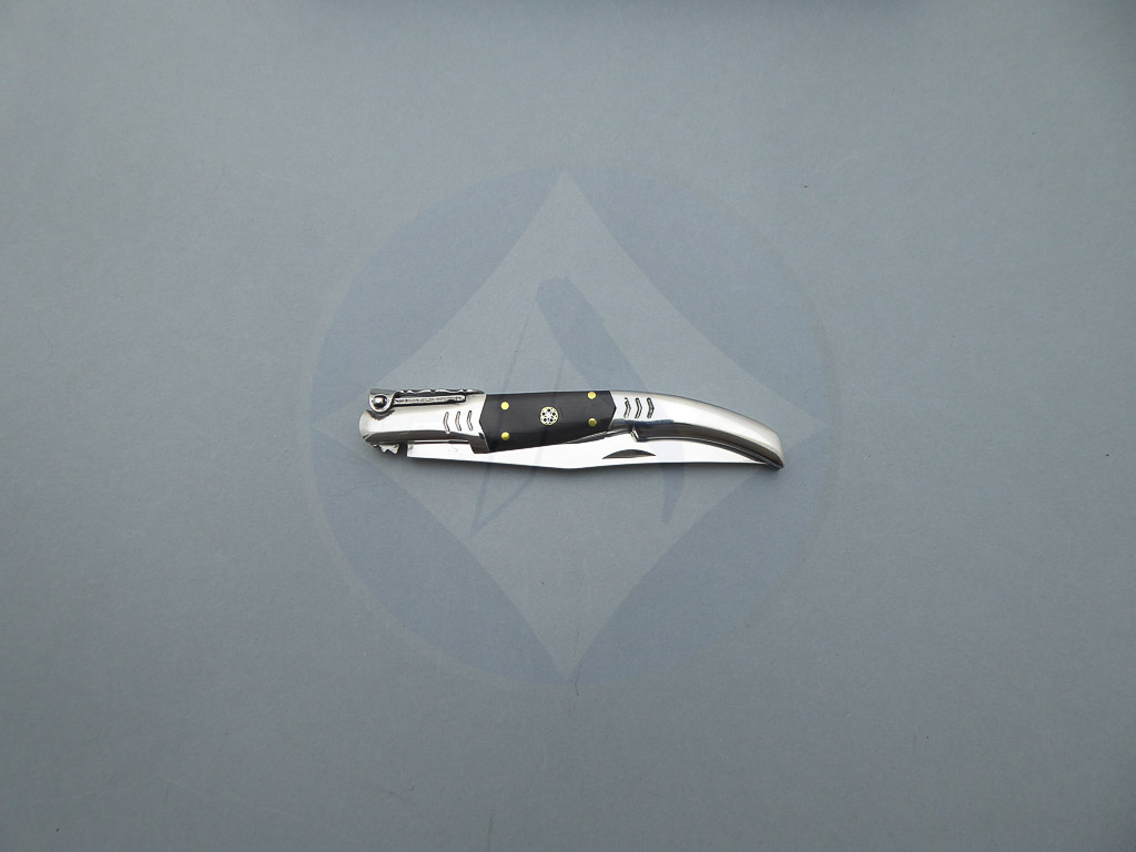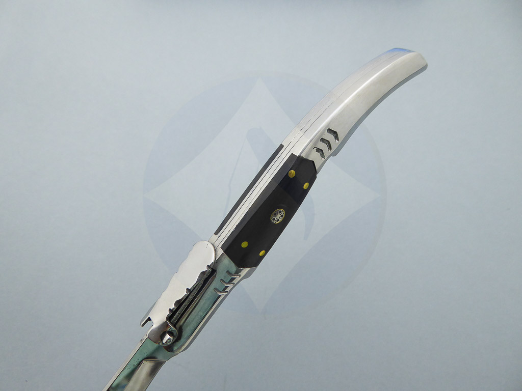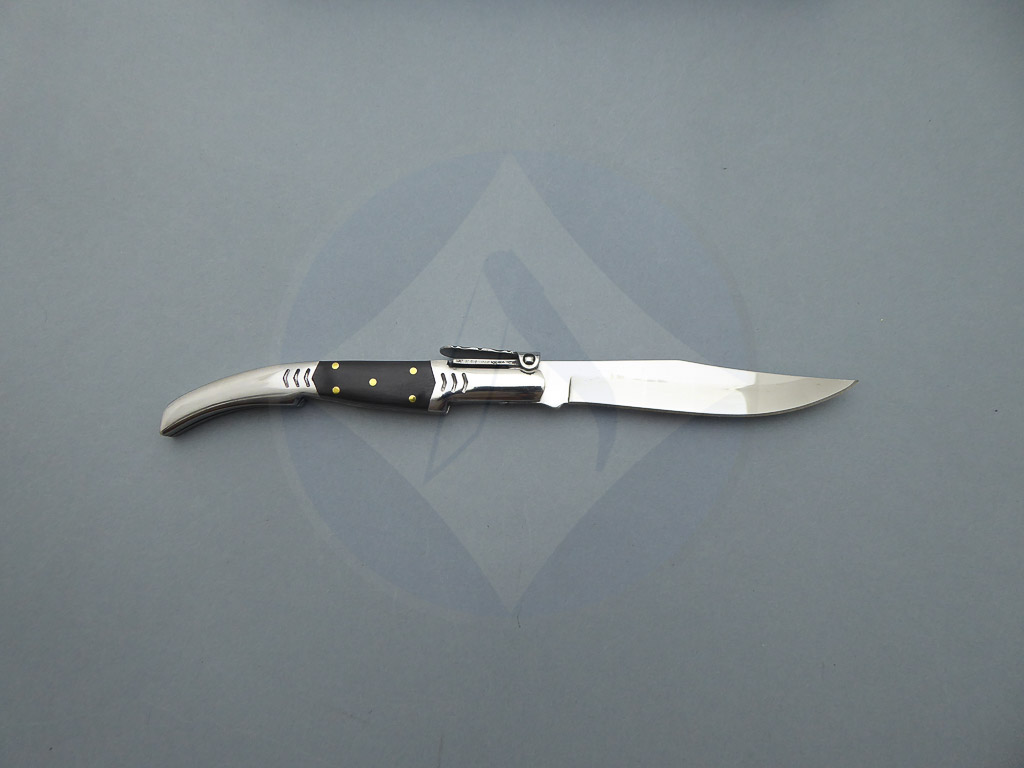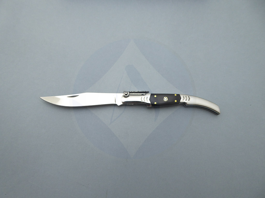 Descripción: Navaja árabe con mango de madera stamina negra y virola de acero. Hoja de acero inoxidable molibdeno vanadio con carraca. El muelle es de acero con palanquilla. Disponible en diferentes acabados.