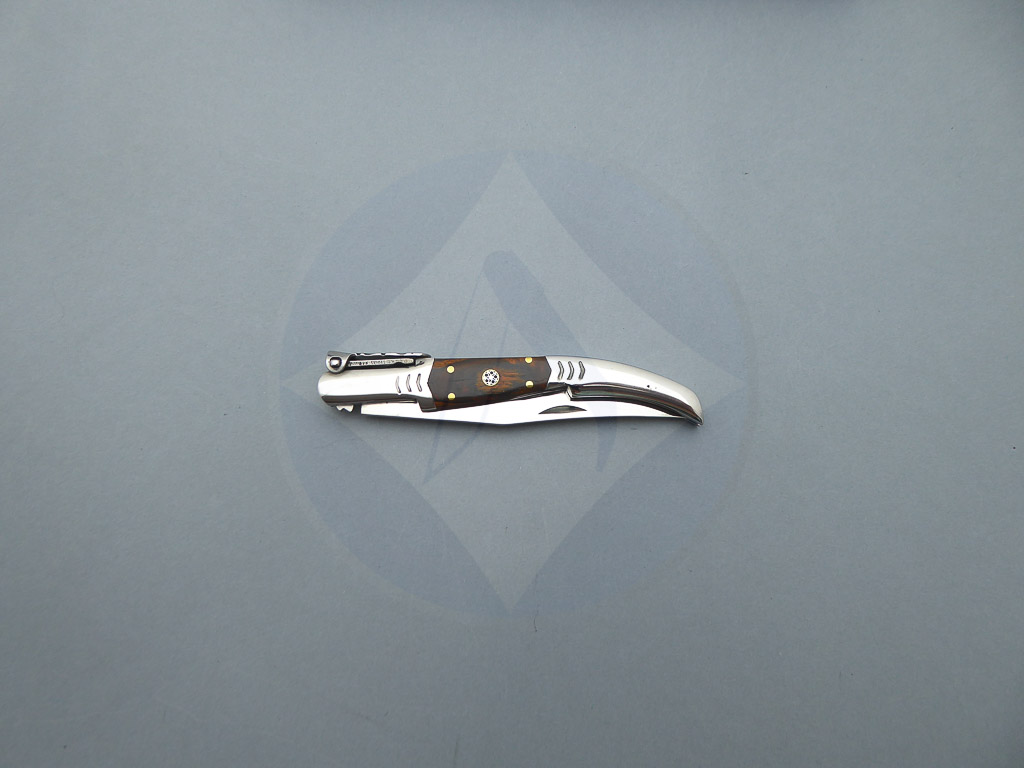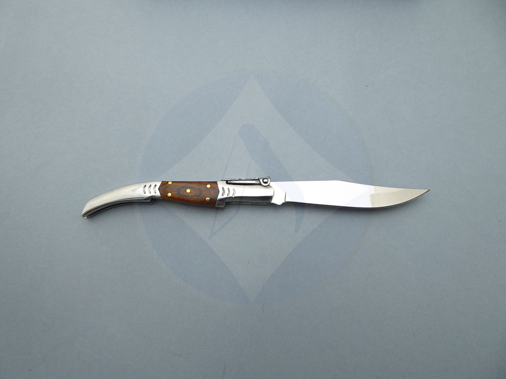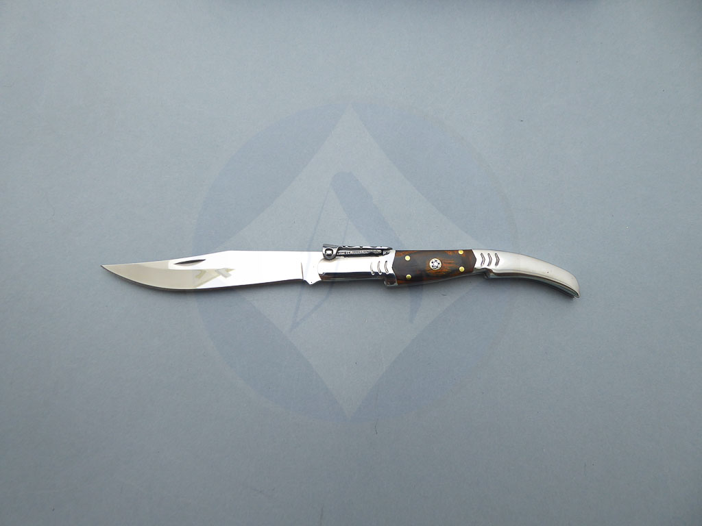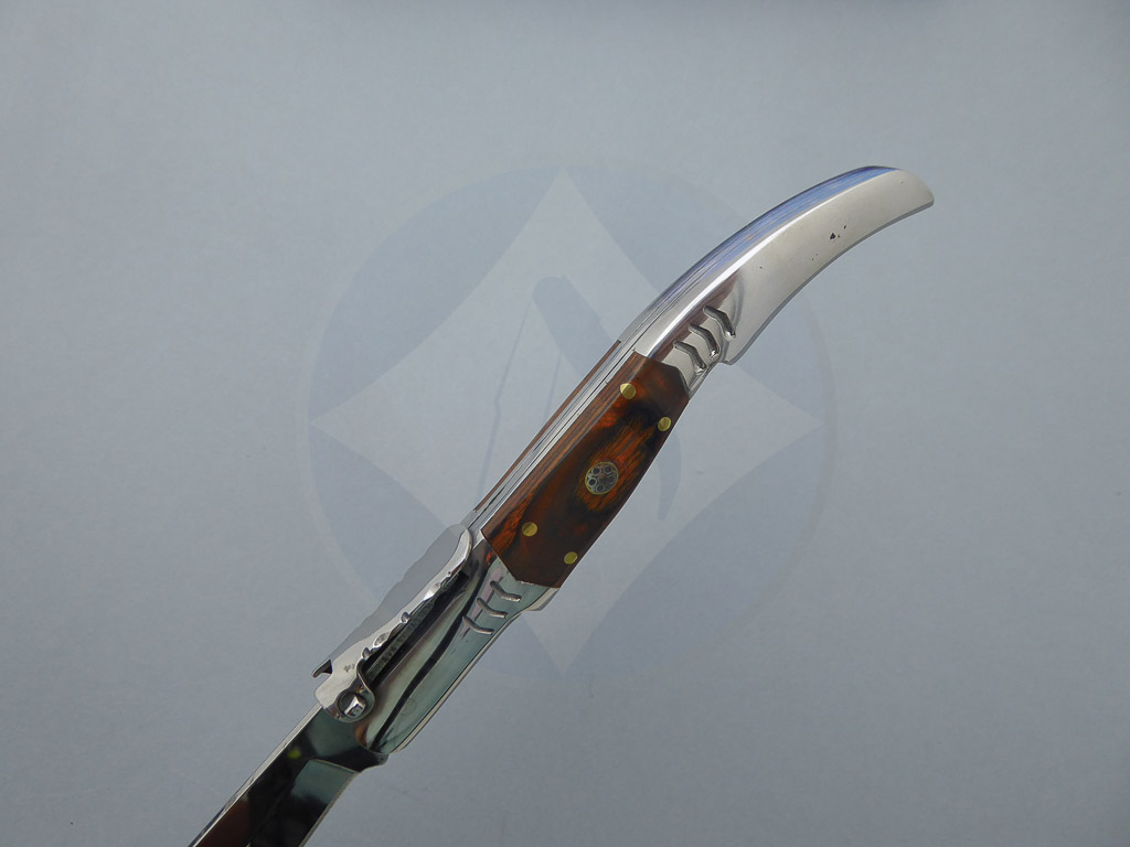 Descripción: Navaja árabe con mango de madera stamina roja y virola de acero. Hoja de acero inoxidable molibdeno vanadio con carraca. El muelle es de acero con palanquilla. Disponible en diferentes acabados.